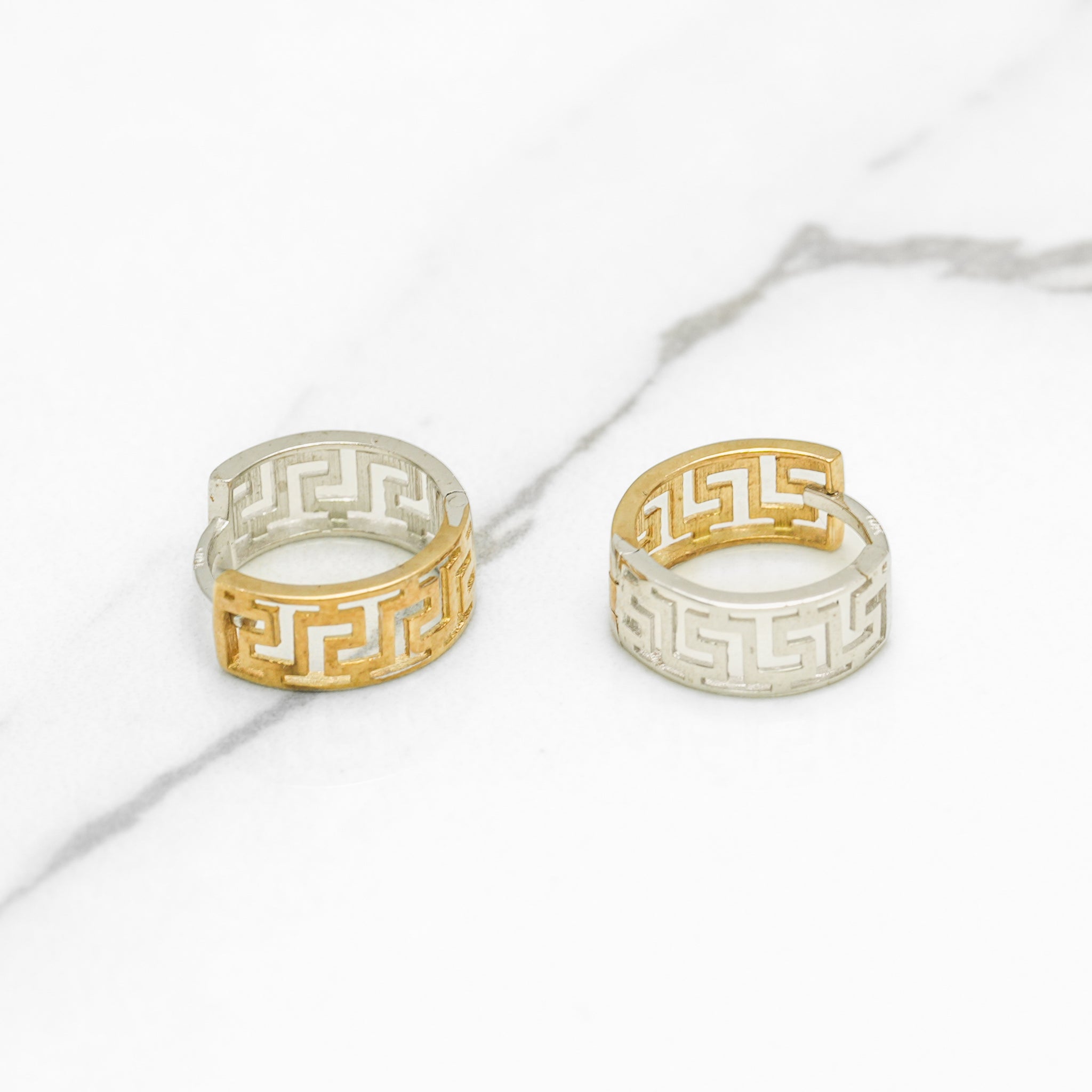Huggies - Two-tone yellow & white 10K gold Greek key design - BOG322