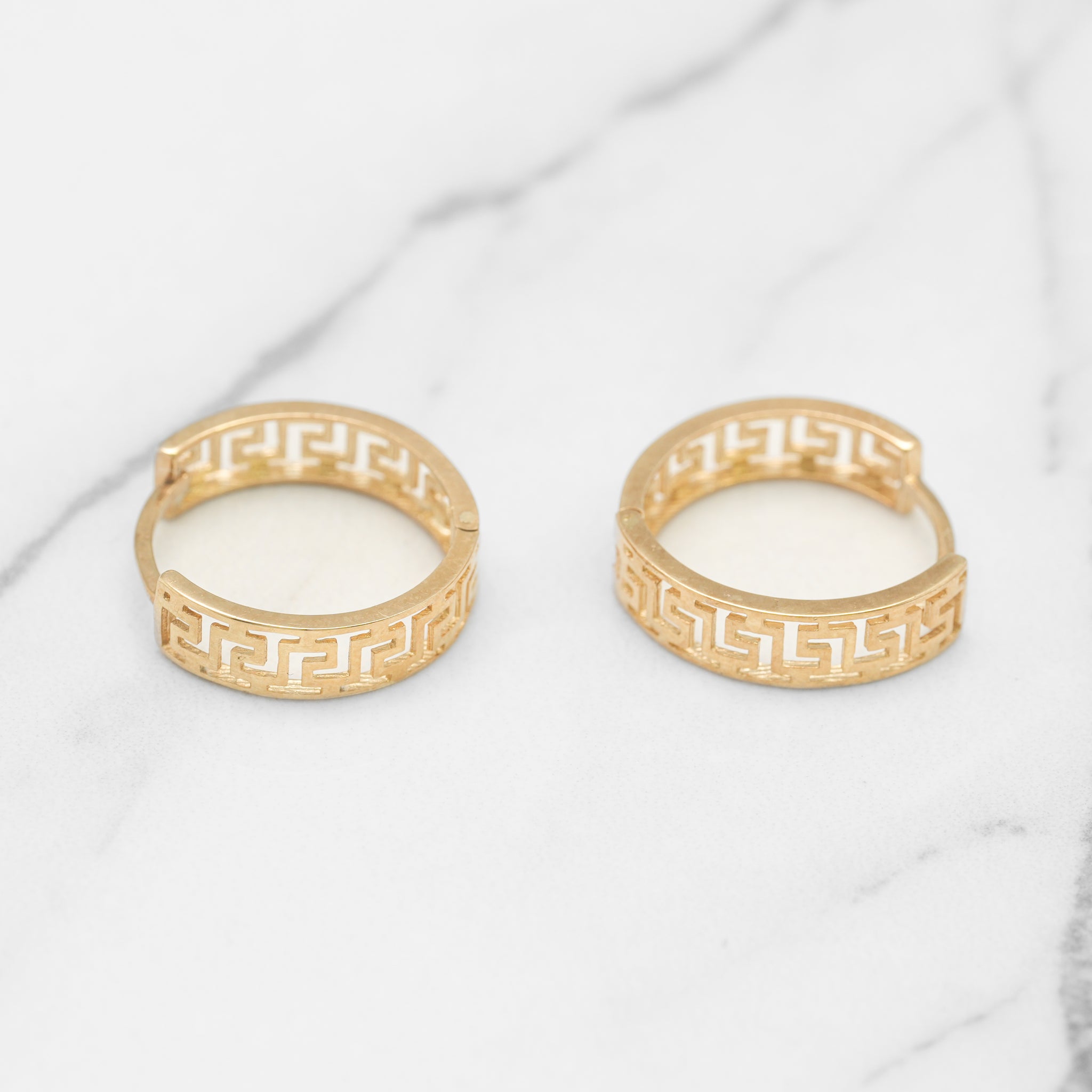 These 10K yellow gold huggies, with a Greek key motif, combine tradition and modernity for a timeless look.