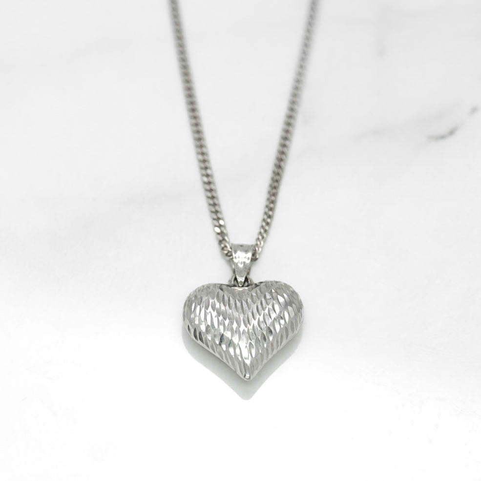 This heart-shaped, diamond-cut pendant in 10K white gold is an expression of purity and elegance. Ideal for those who love refined, symbolic jewelry.