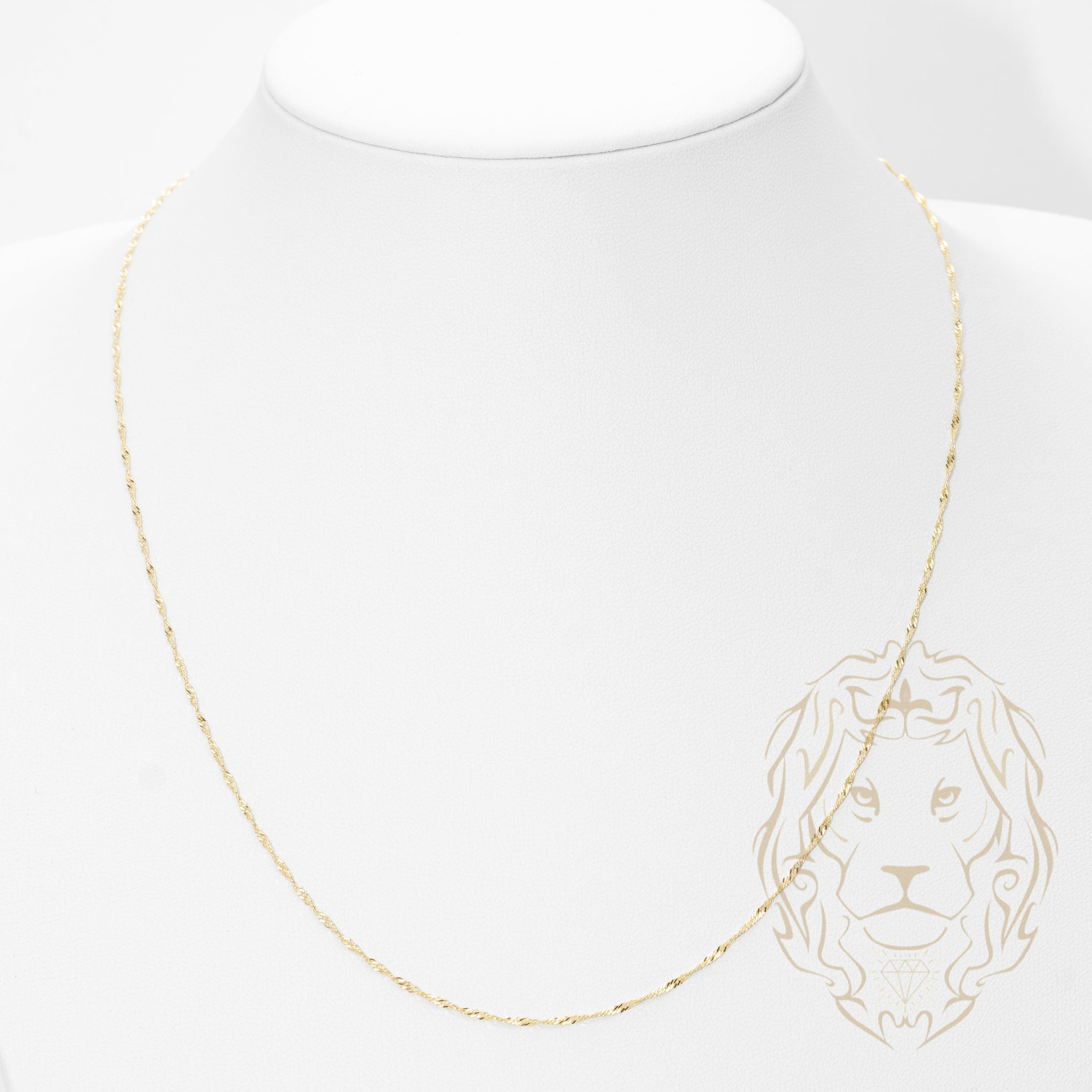 This 10K yellow gold chain, with 1.2mm singapore links, offers a touch of subtle sophistication.