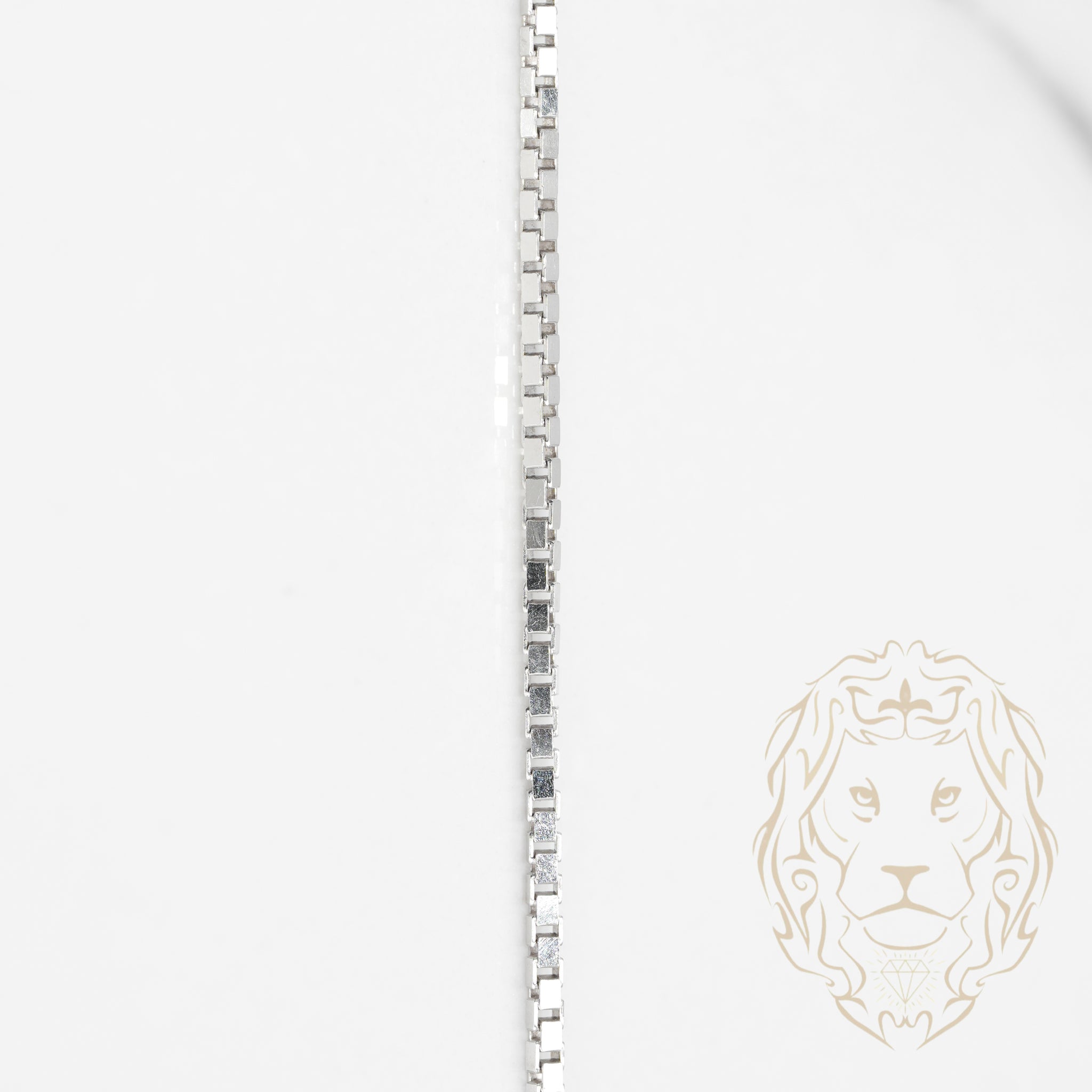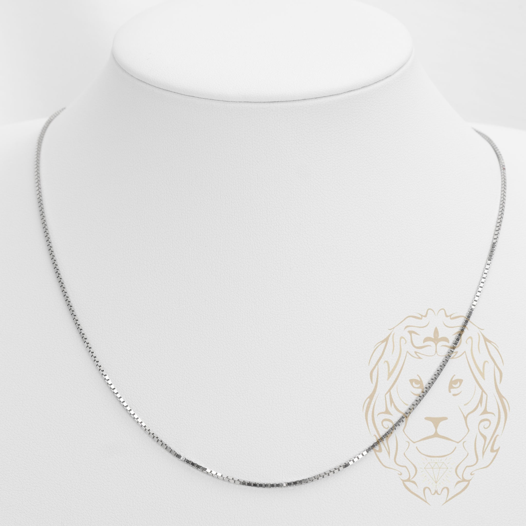 This 1.2 mm 10K white gold box link chain combines structure and brilliance, ideal for clean, modern looks.