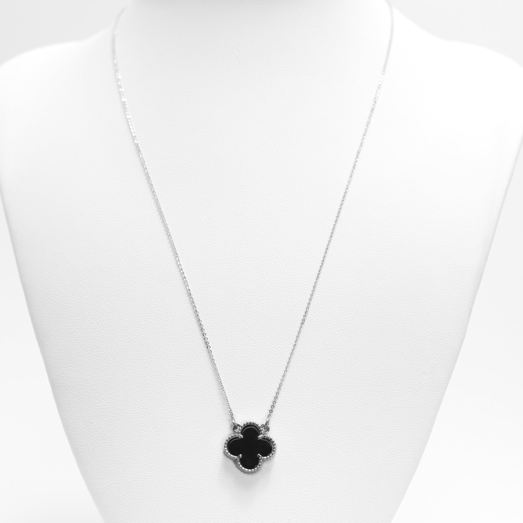 This 18-inch 10K white gold chain for women, with cable links and a black trefoil pendant, offers modern, symbolic elegance. Perfect for those looking for a distinctive and refined piece of jewelry.