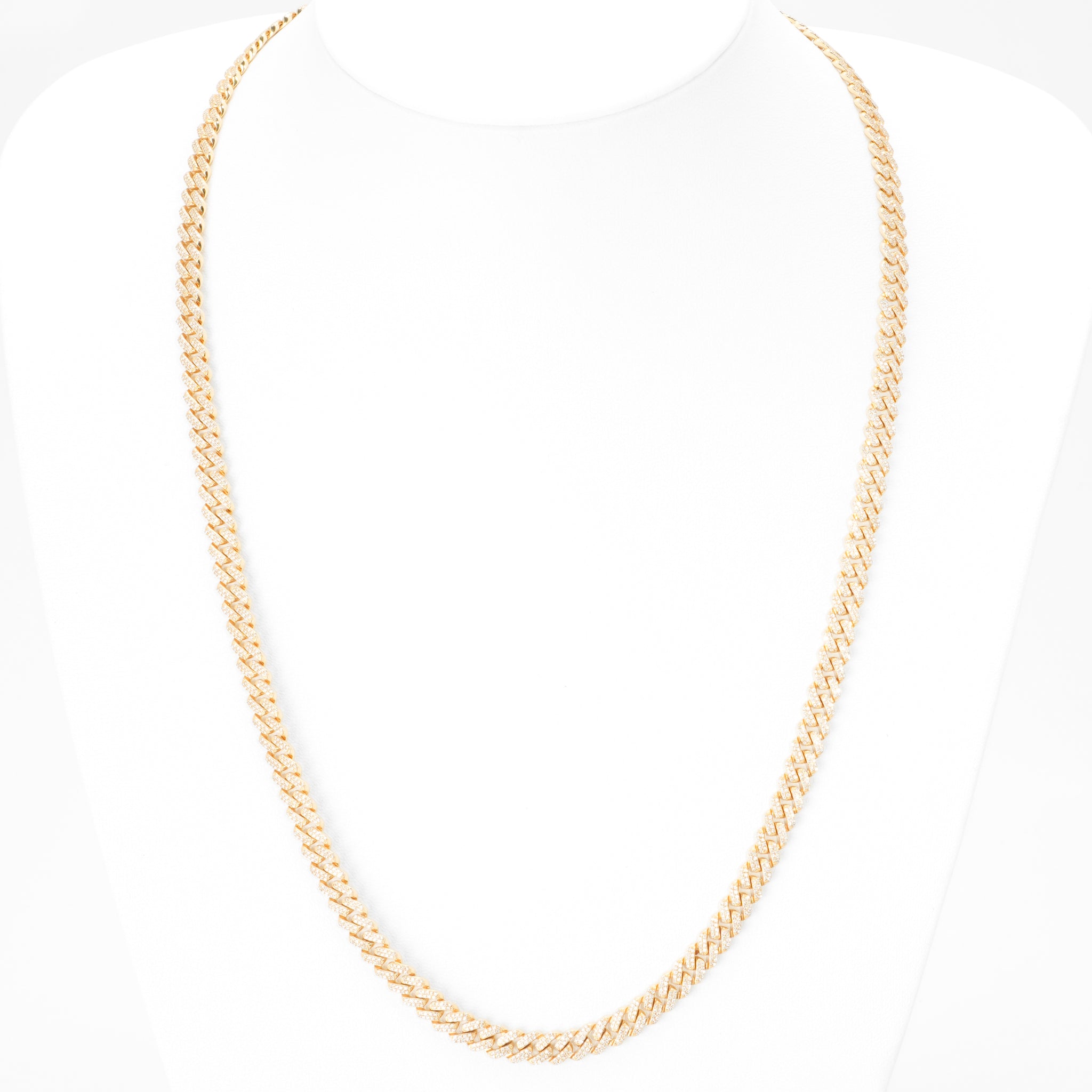 This 10K yellow gold chain with Cuban links is paved with 5.76 carats of natural diamonds, for an eye-catching sparkle.