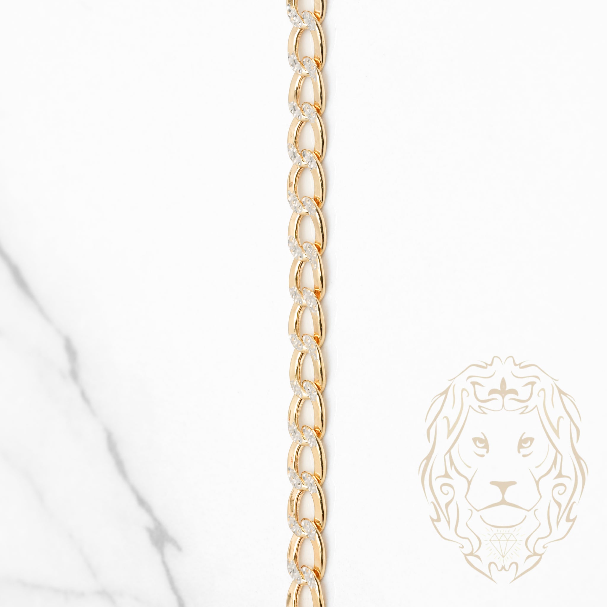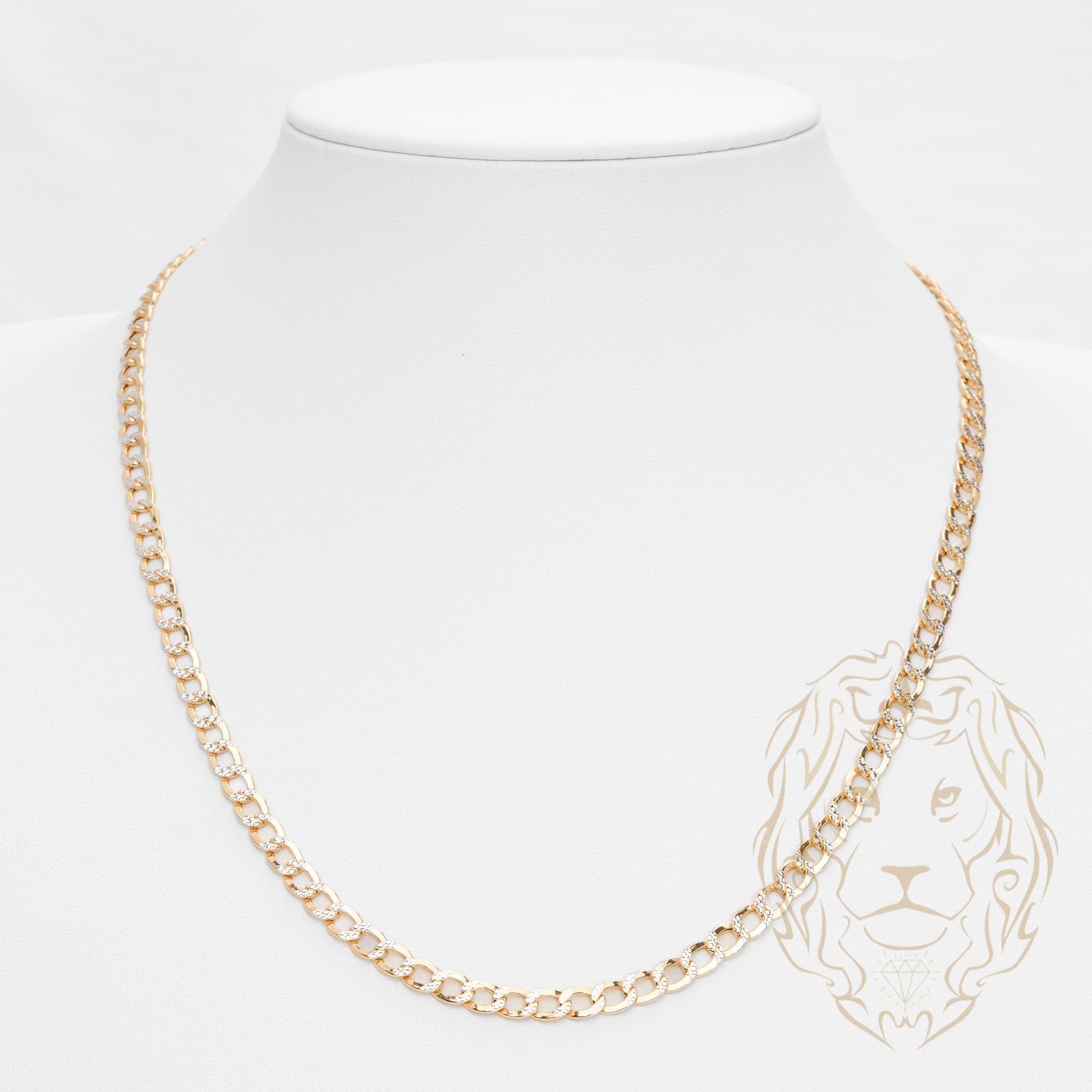 Chaîne curb deux tons 4.8mm en or 10K, travaillée en coupe diamant pour une brillance remarquable. Un design prestigieux qui se démarque immédiatement.