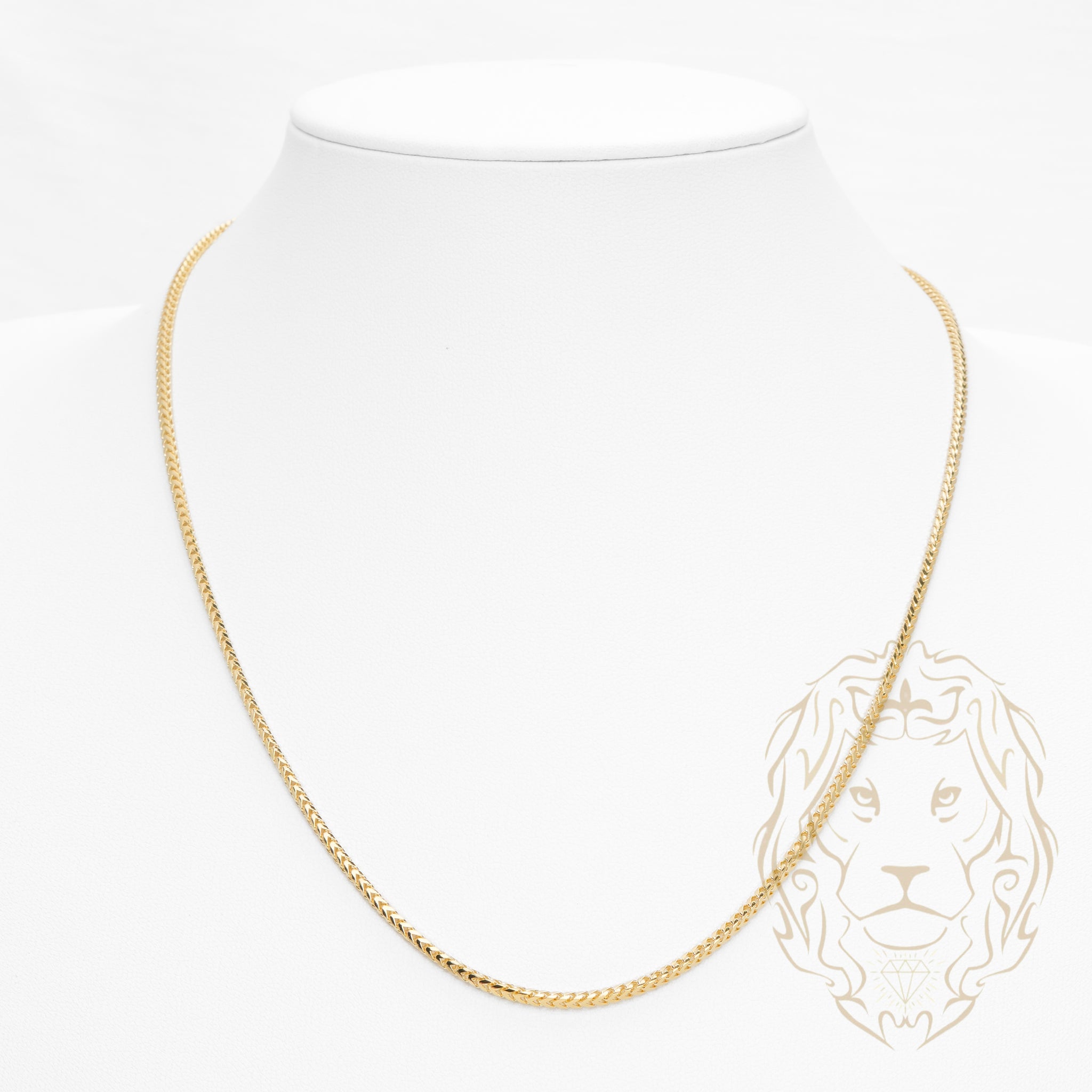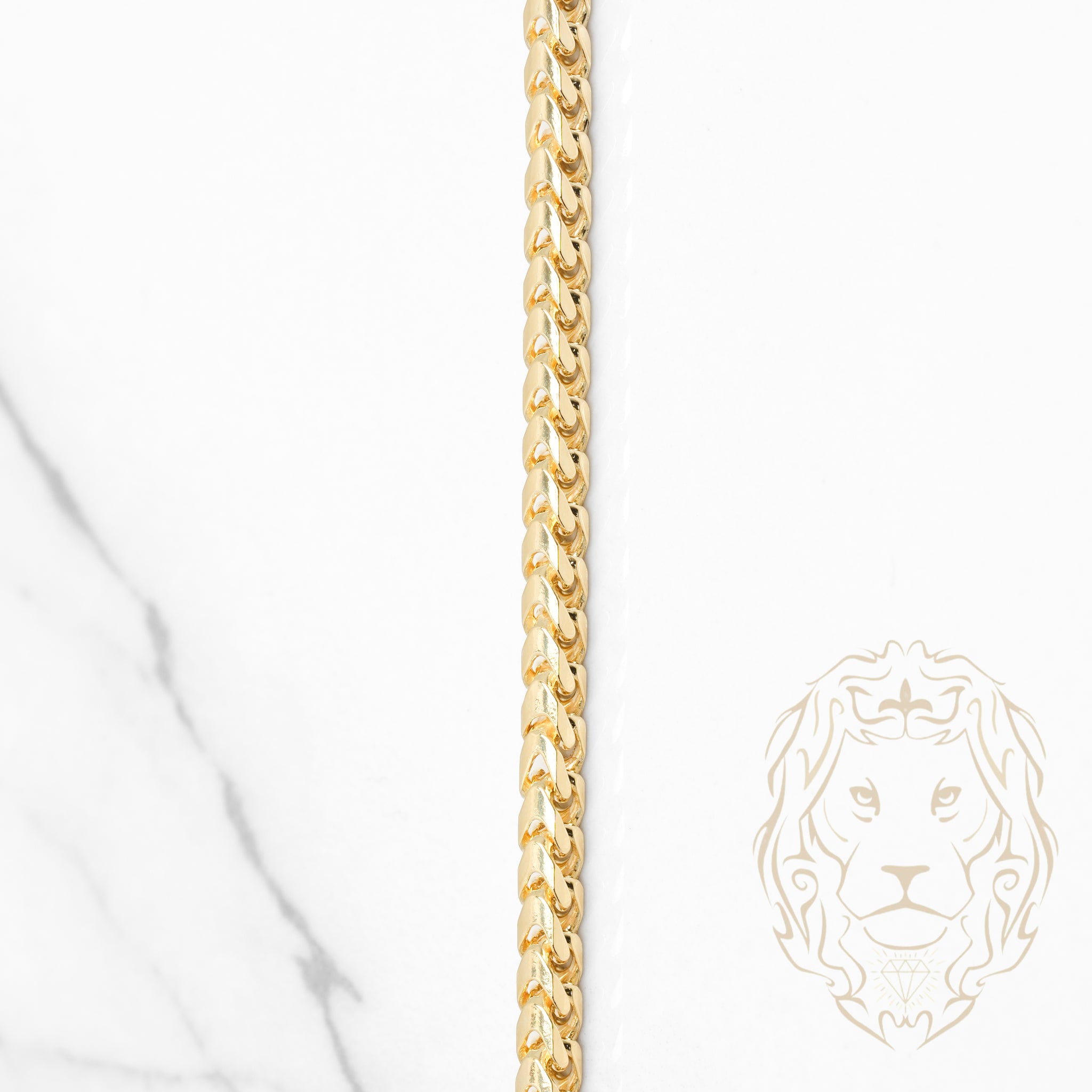 Cette chaîne franco solide 3mm en or 10K jaune se distingue par sa robustesse et sa brillance uniforme, un choix idéal pour une pièce signature.