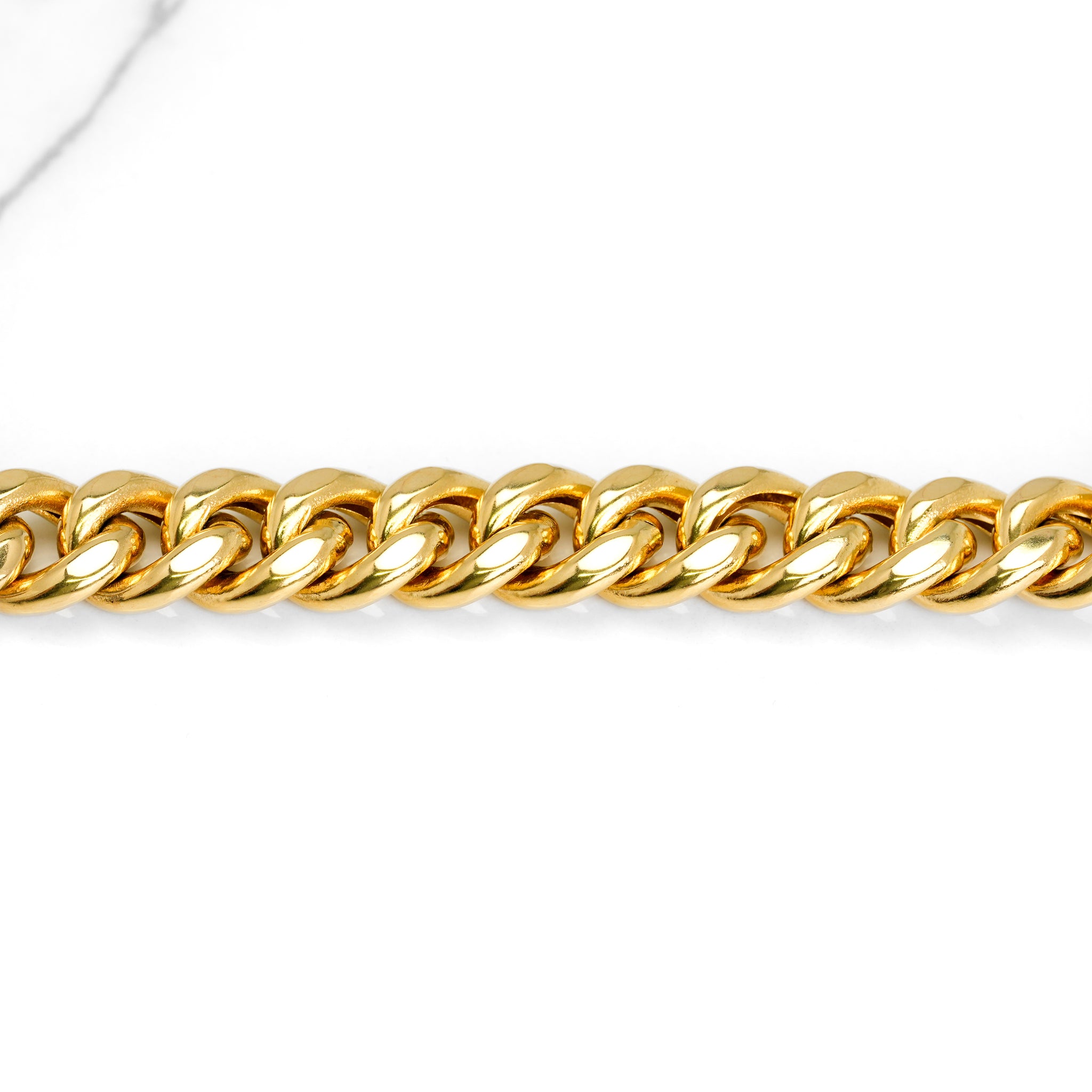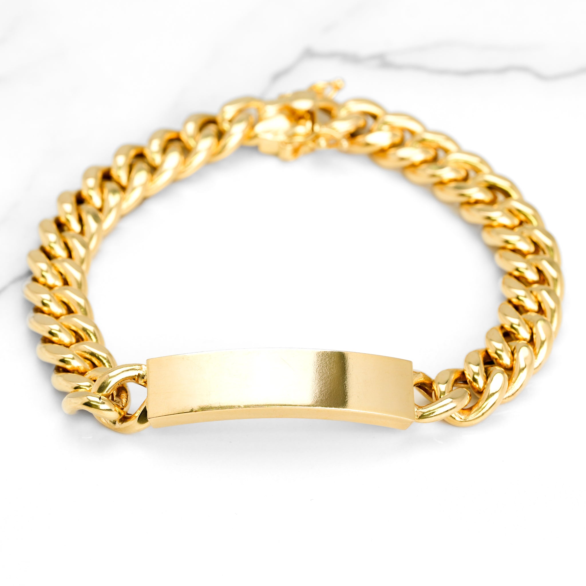 This 10K yellow gold bracelet for men, with an engraved bar and Cuban links, lets you add a personal touch to your jewelry. At 9 inches long, it's ideal for those looking for a unique and meaningful style.