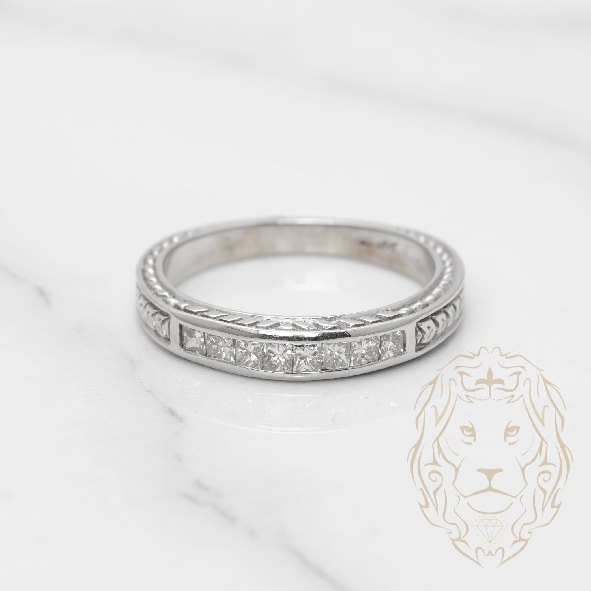 This 14K white gold bezel, adorned with 0.25 carats of channel-set radiant-cut natural diamonds, is a luxurious addition to any jewelry collection.