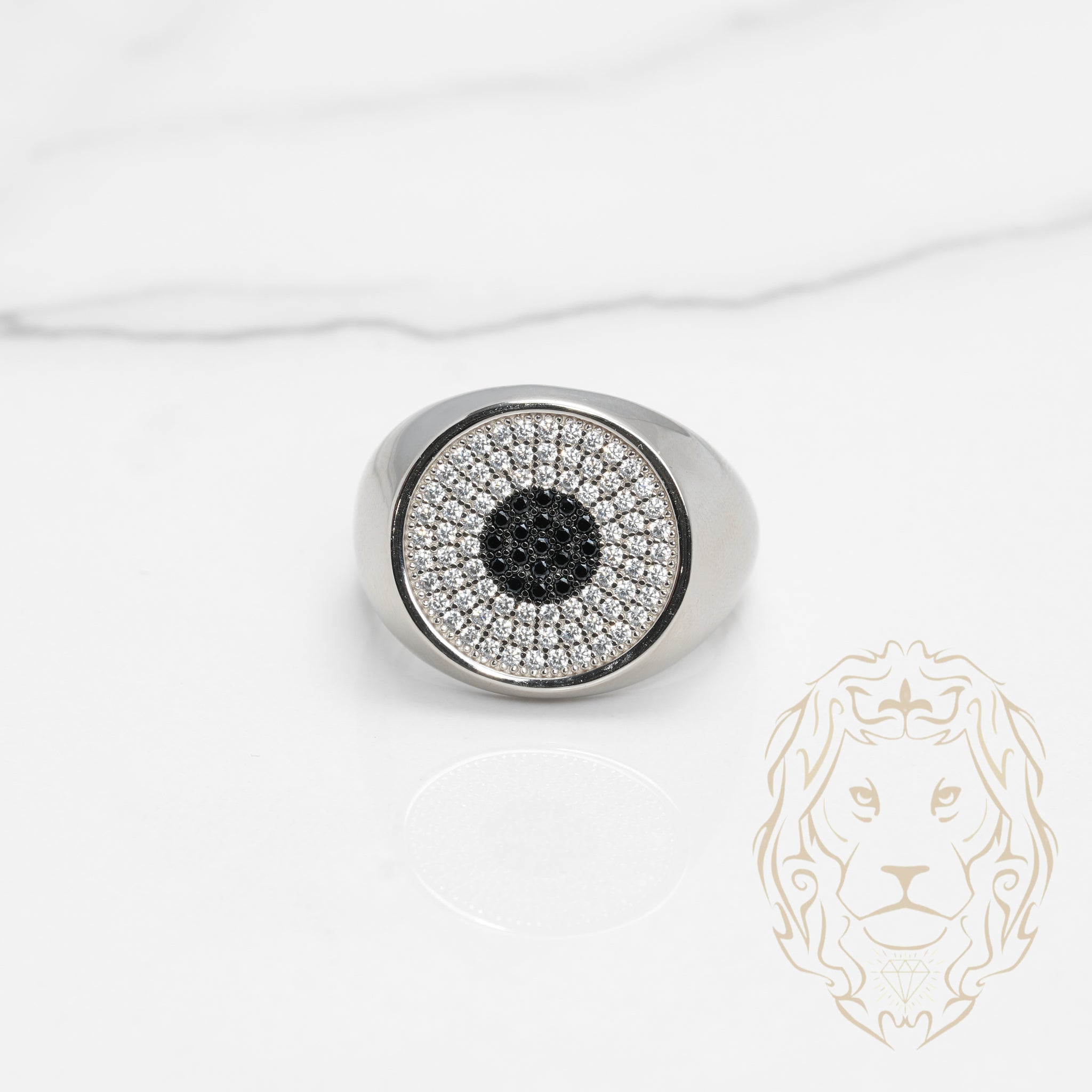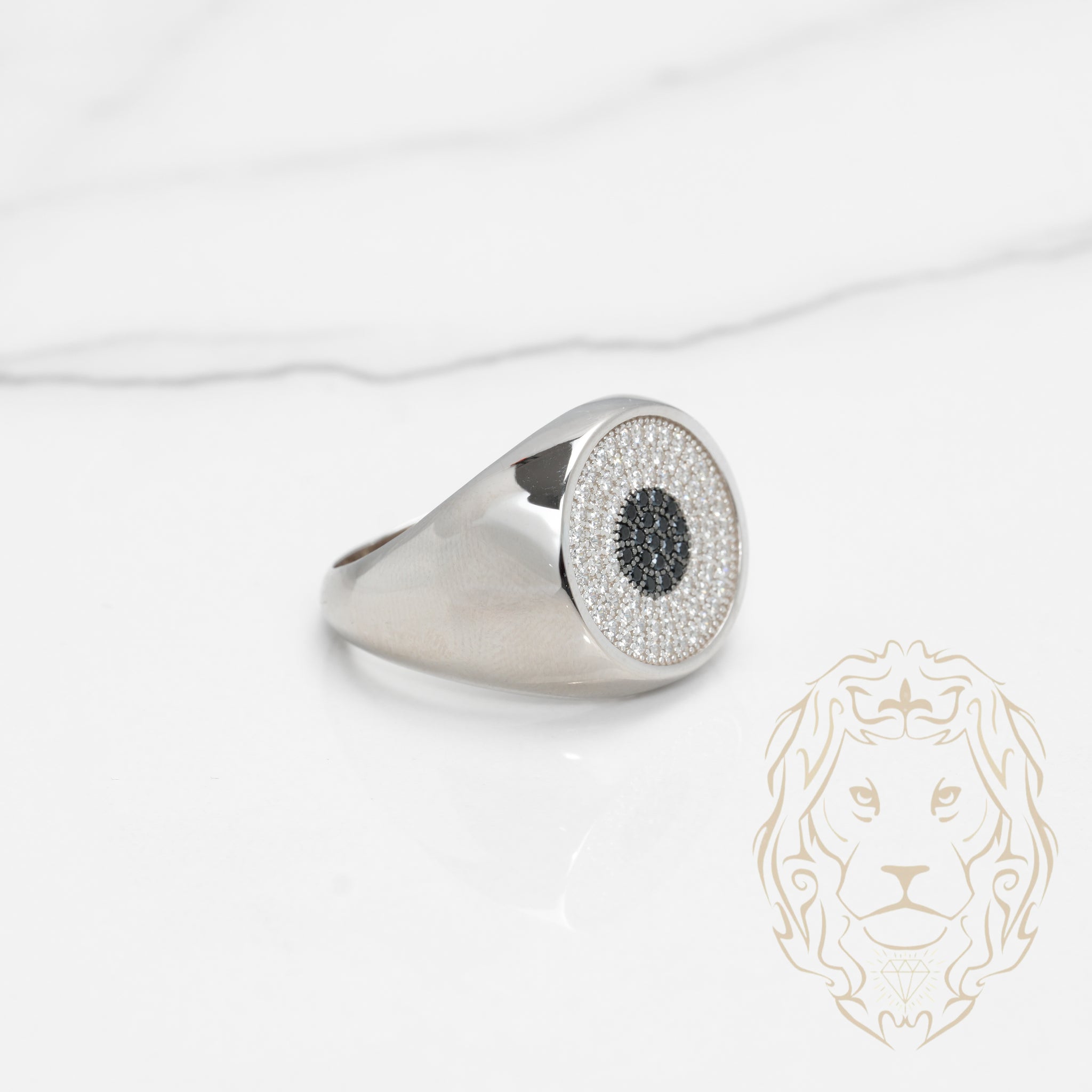 Ce signet rond en argent allie cz noirs et blancs dans un motif équilibré pour un style original et raffiné.