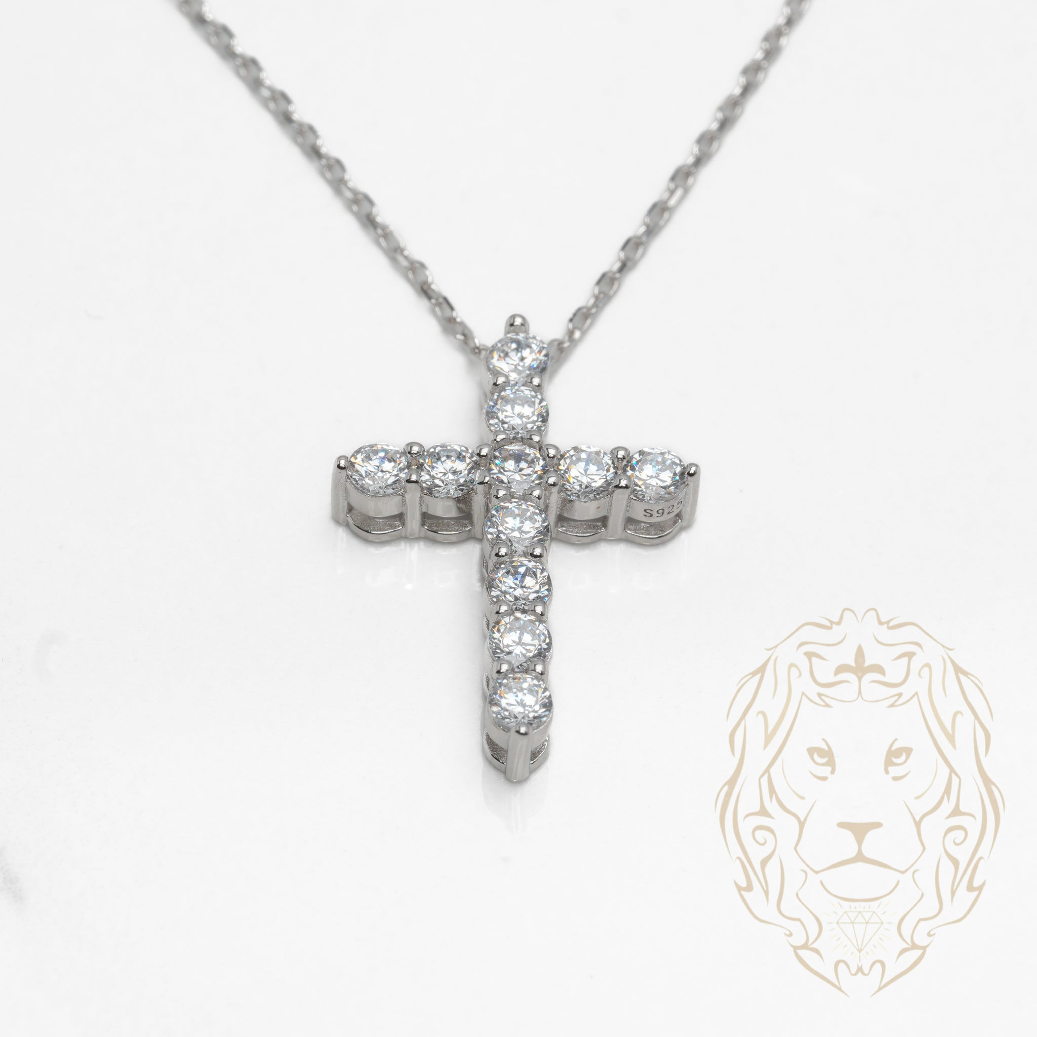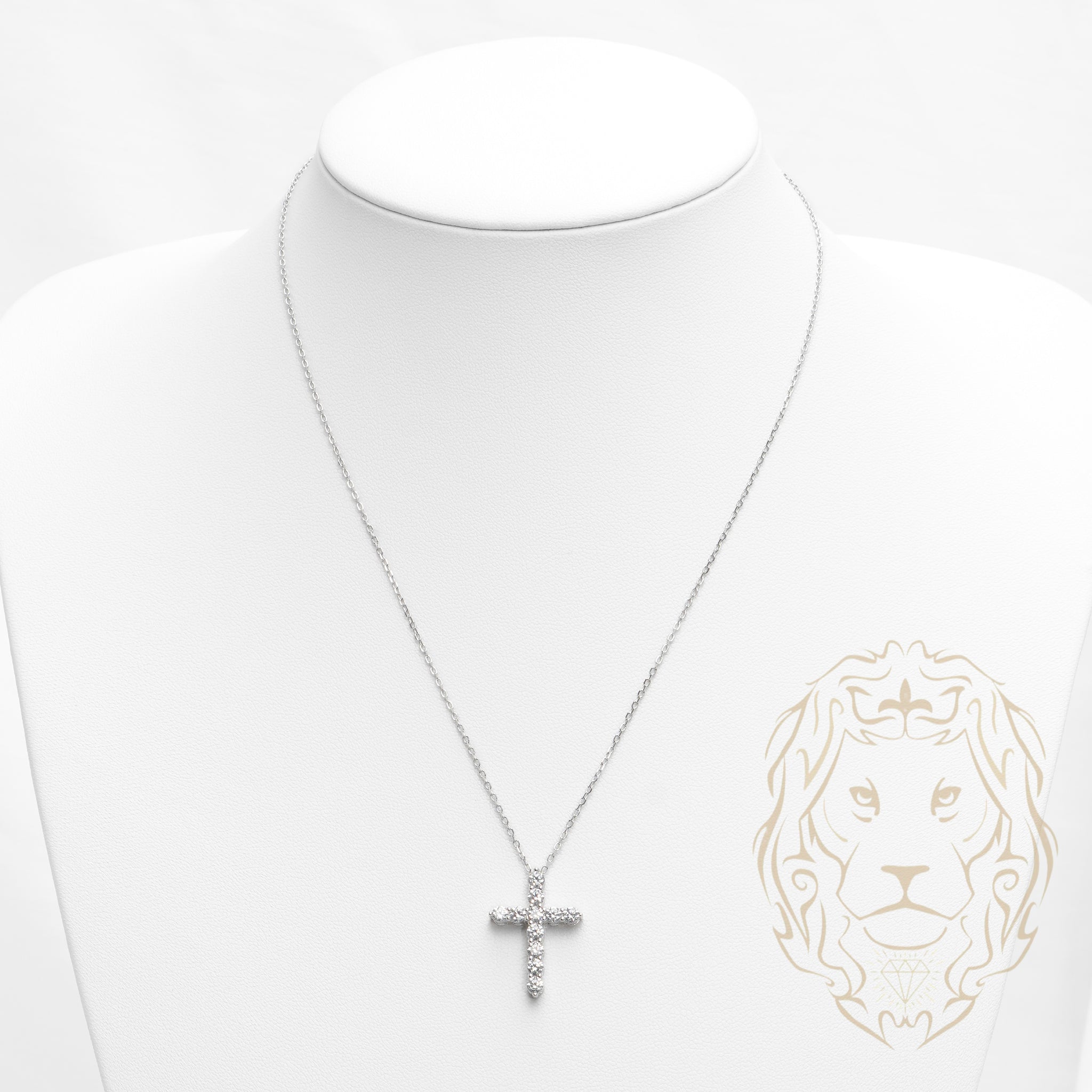 Une croix classique entièrement sertie de pierres cz, suspendue à une chaîne en argent.
