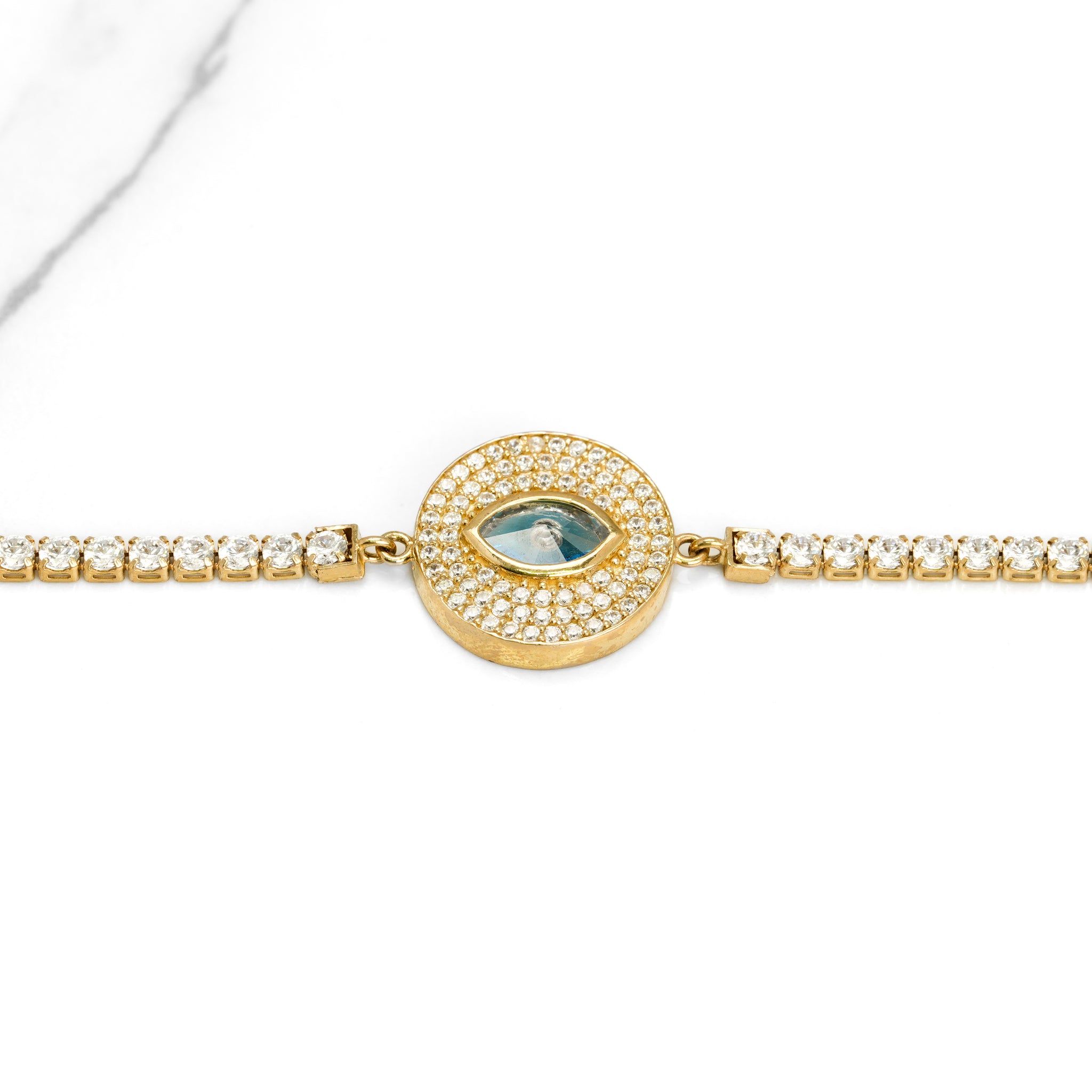 This 10K yellow gold tennis bracelet, decorated with a circle and a cz-paved evil eye, embodies both protection and eternity. With a length of 8 inches, it combines elegance and symbolism.