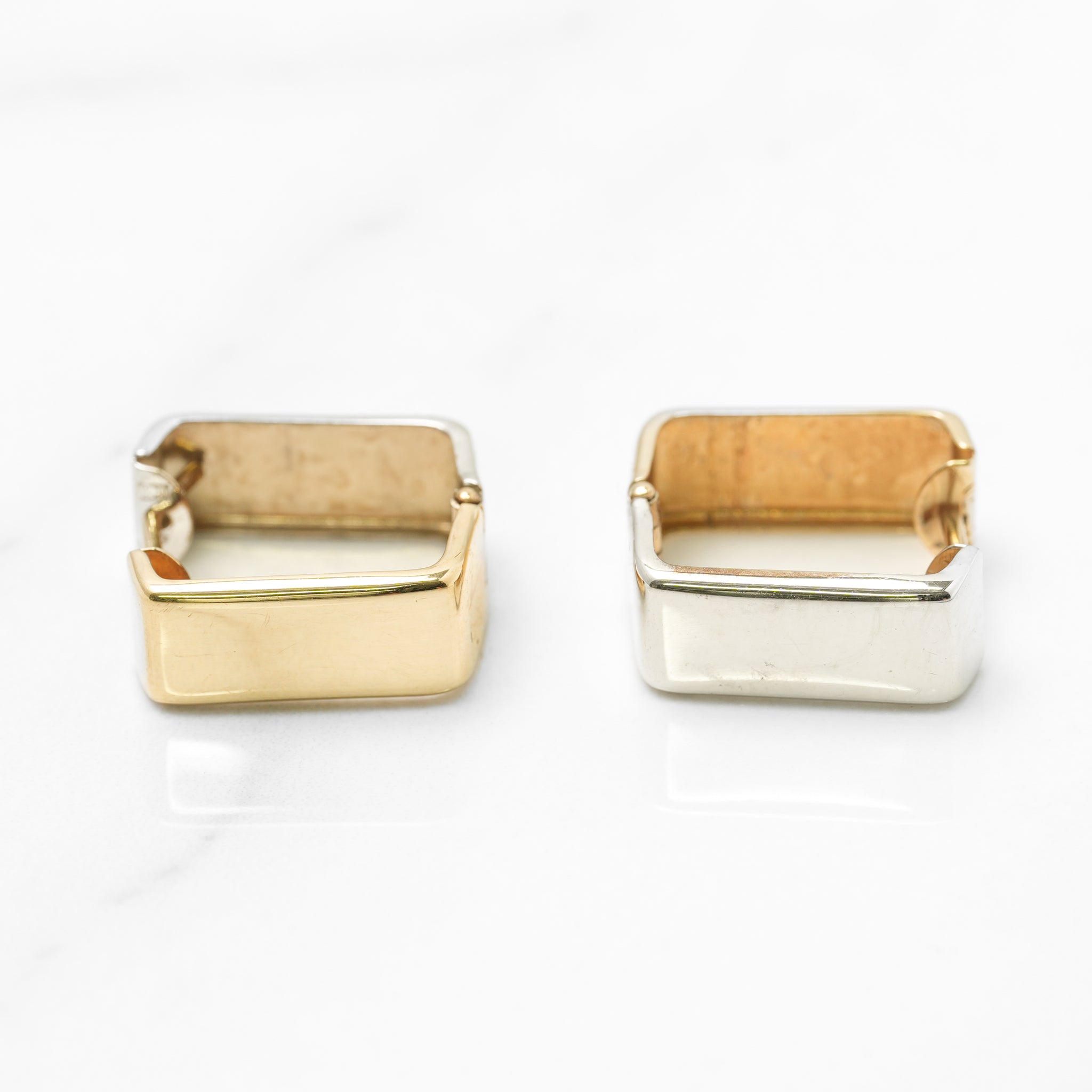 These two-tone yellow and white 10K gold huggies feature a polished rectangular shape, offering a simple yet elegant look. Perfect for those who prefer a minimalist yet refined style.