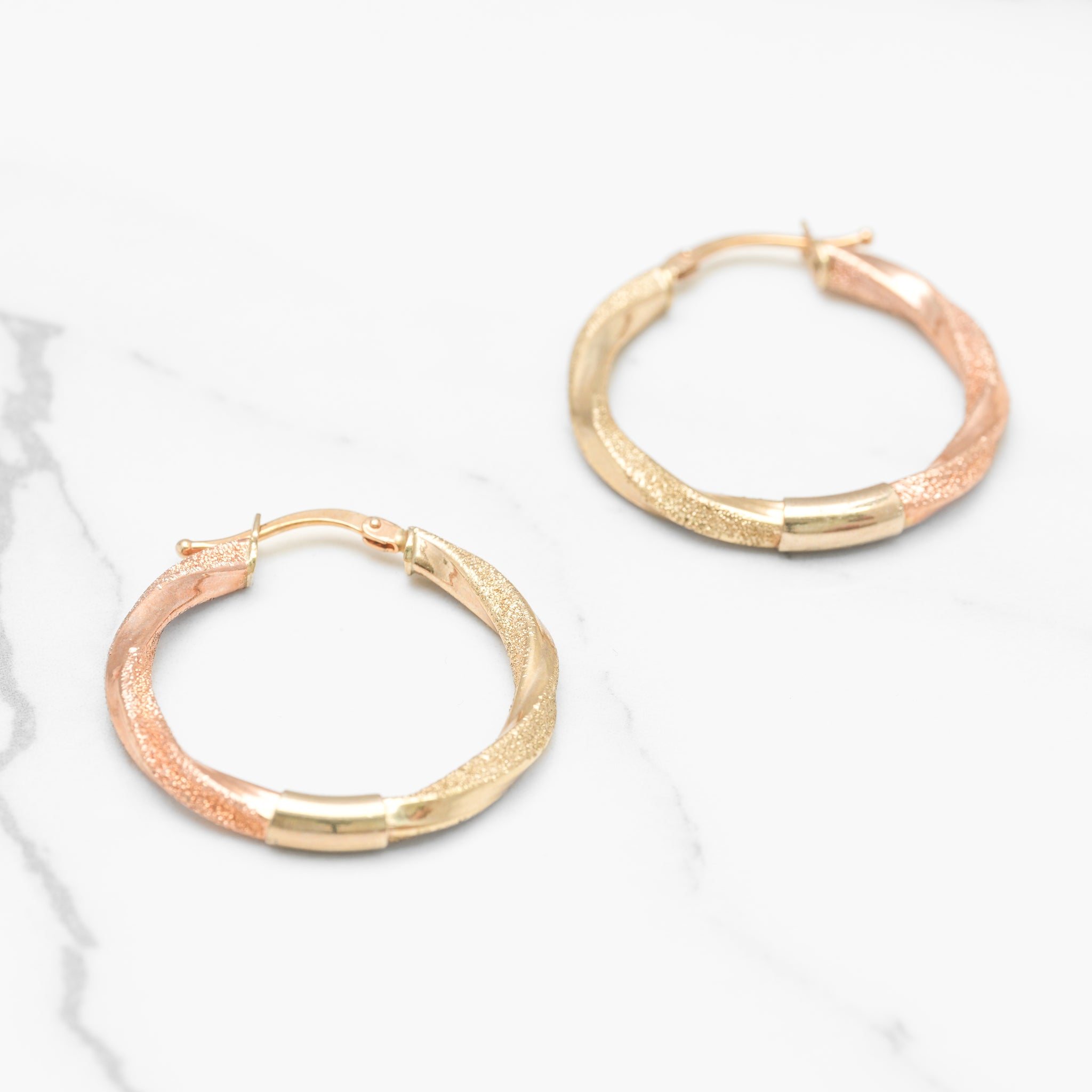 In two-tone yellow and pink 10K gold, these hoops with a twist and diamond texture offer a perfect harmony of colors and textures.