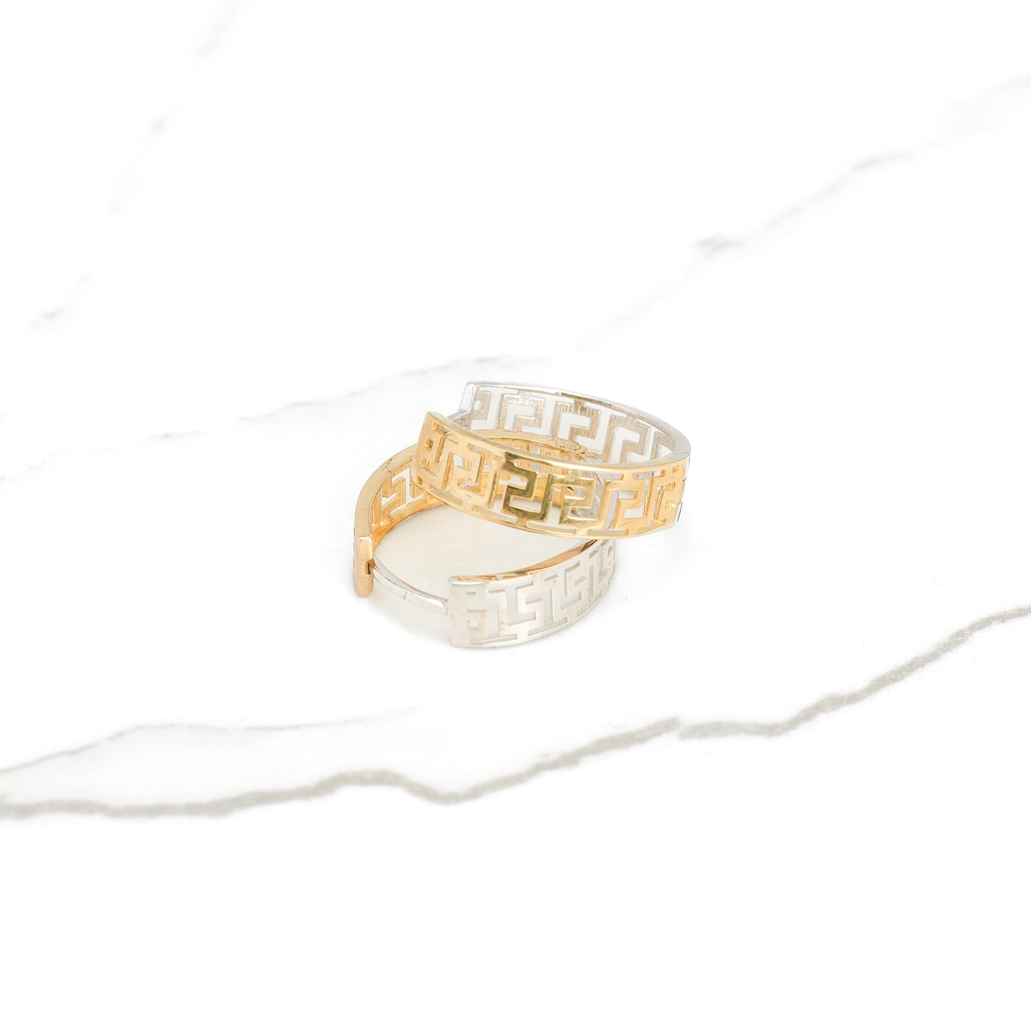 These two-tone 10K gold hoops with a Greek key motif harmoniously blend classicism and modernity for a unique, refined style.