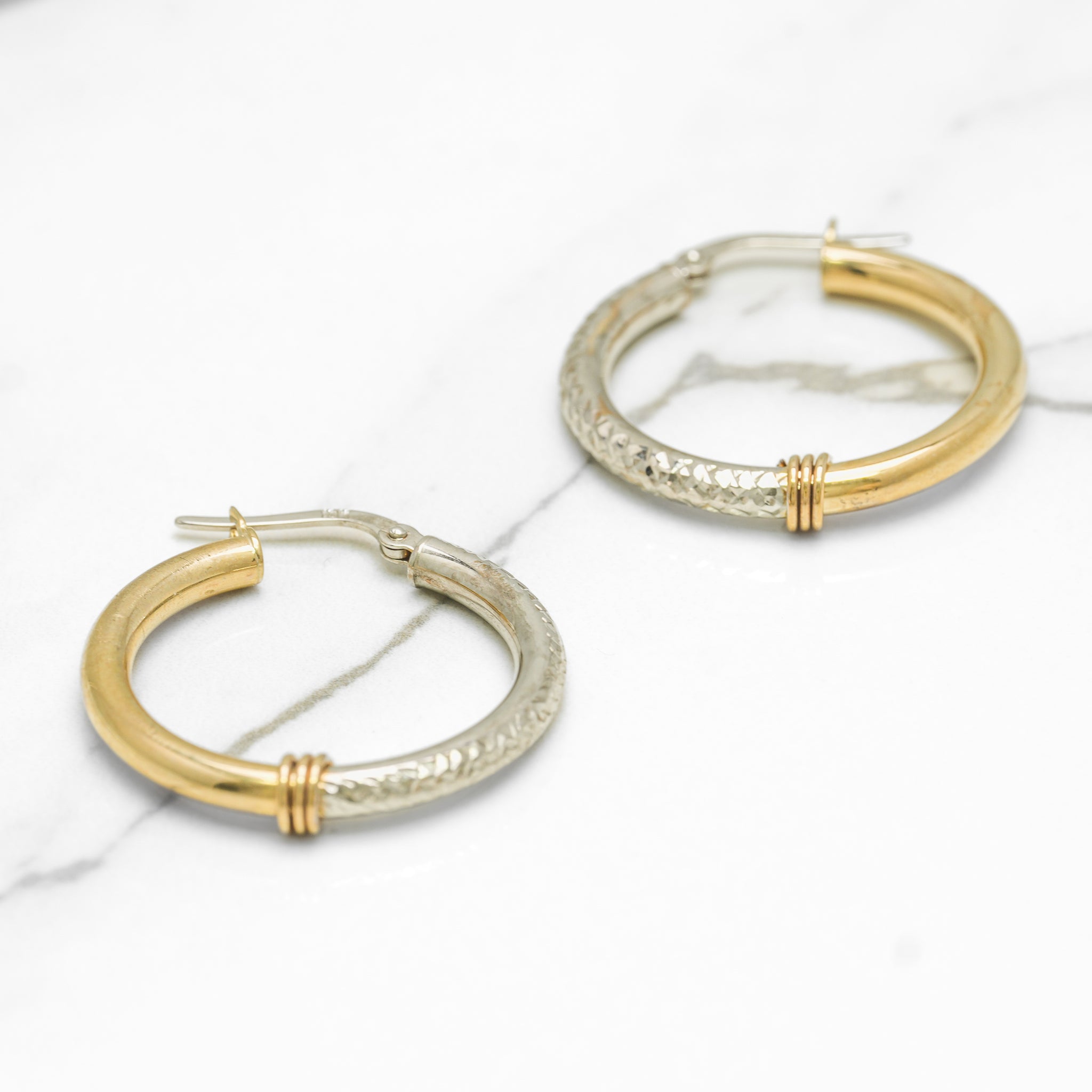 These two-tone, yellow and white 10K gold hoops, with a half-and-half design and diamond cut, are perfect for those who love distinctive jewelry. An ideal choice for a modern, elegant look.