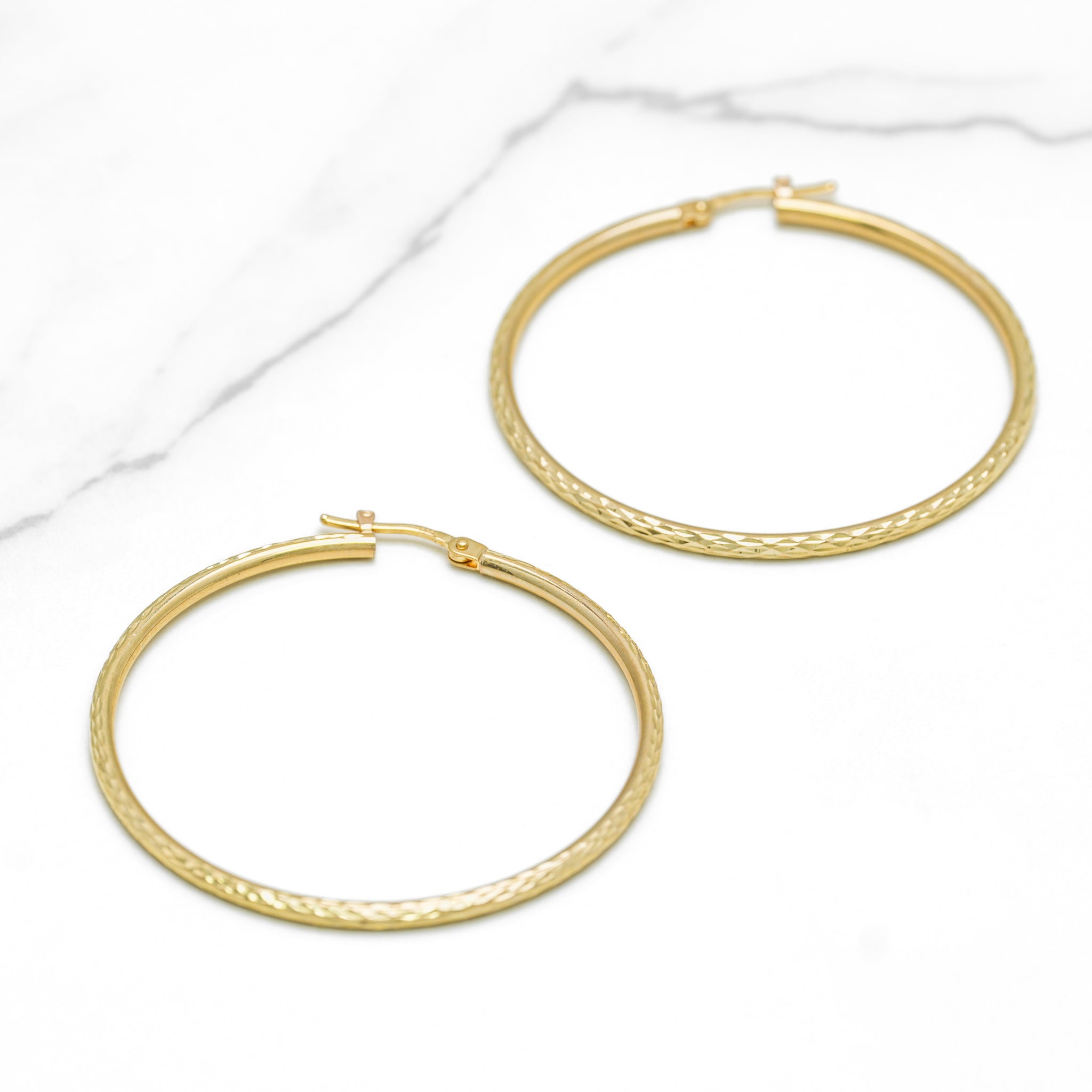 These 10K yellow gold hoops, adorned with a diamond cut, are an essential piece of jewelry for any collection. Perfect for everyday wear with a touch of elegance.
