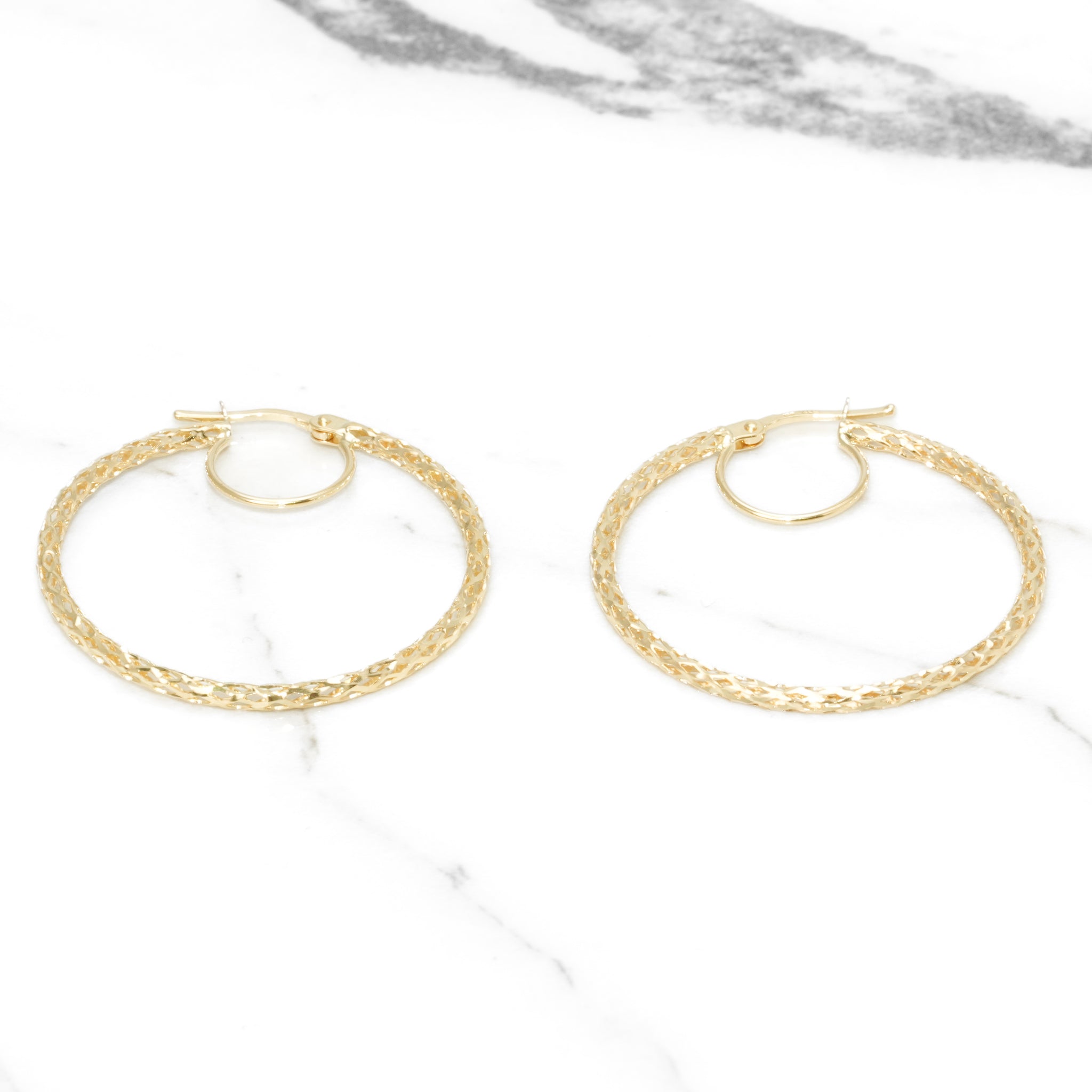 These 30mm hoops in 10K yellow gold, with a geometric finish and 2mm diamond cut, are ideal for a refined look. Their lightweight, elegant design lets you wear them effortlessly all day long.