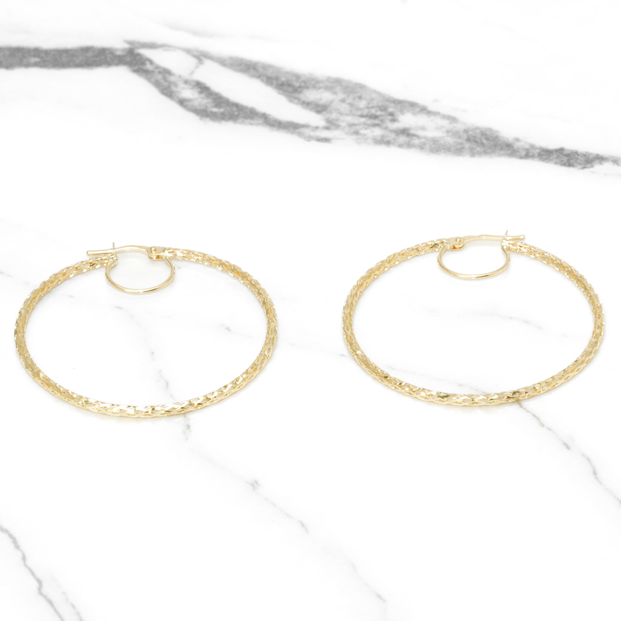 These 45mm geometric hoop earrings in 10K yellow gold add a touch of glamour and sophistication with their diamond-cut design.