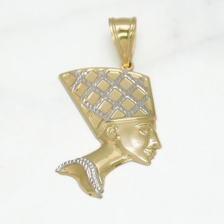 This pendant in two-tone 10K gold, yellow and white, depicting Nefertiti with a diamond cup, embodies beauty and royalty. A magnificent piece for those who admire Egyptian history and elegance.