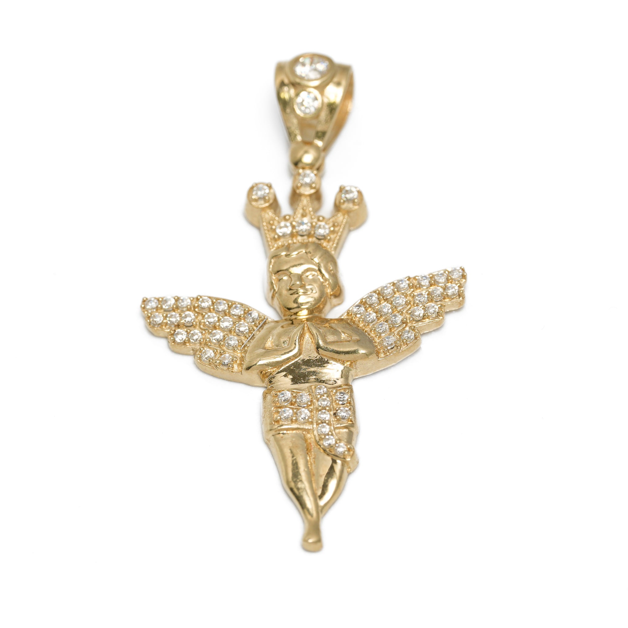 This 10K yellow gold angel pendant with cz pavé crown combines royal radiance and protection. Perfect for a sophisticated and meaningful look.
