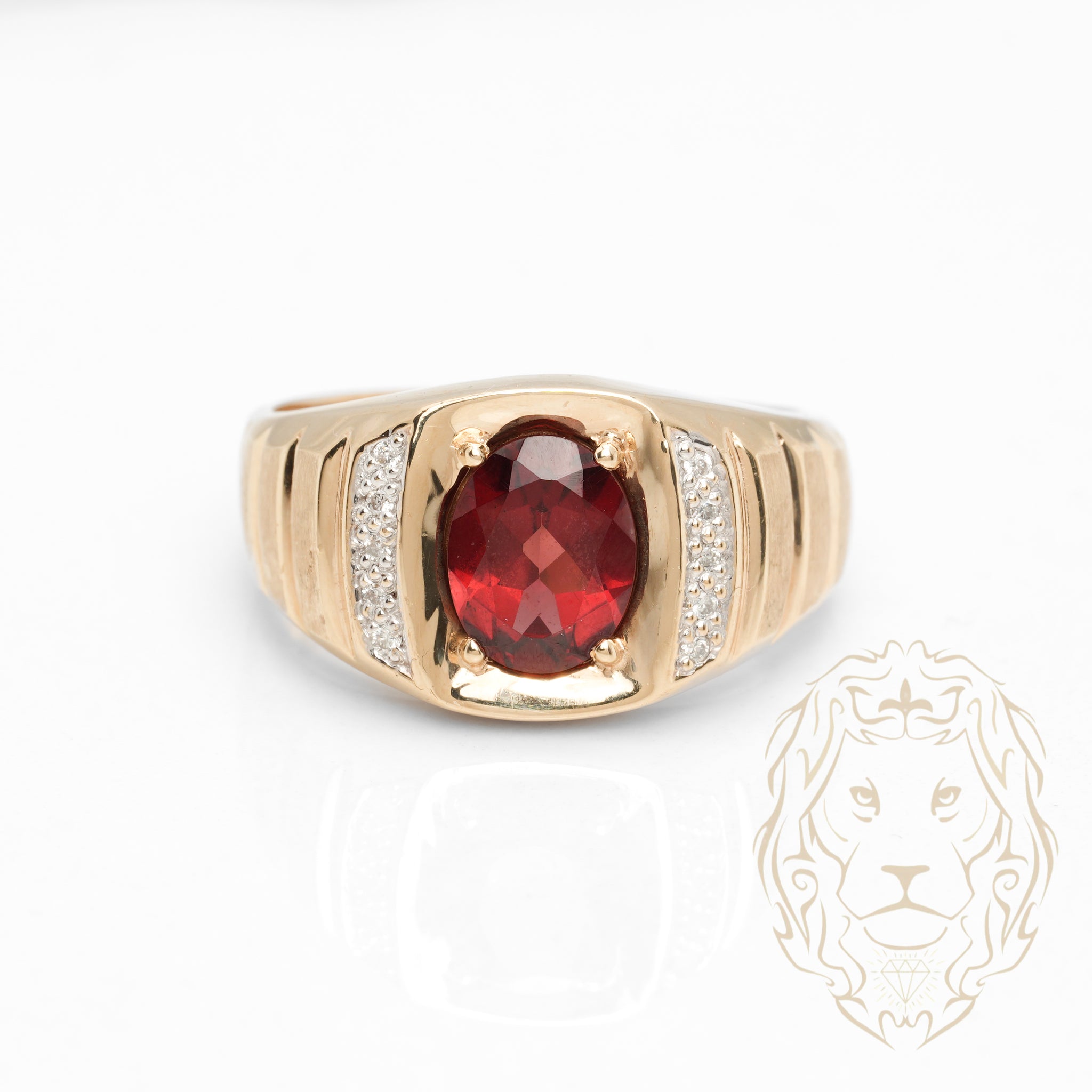 Un rubis synthétique ovale vibrant, encadré de diamants naturels 0.10CT sur or 10K jaune. Élégance et intensité réunies.