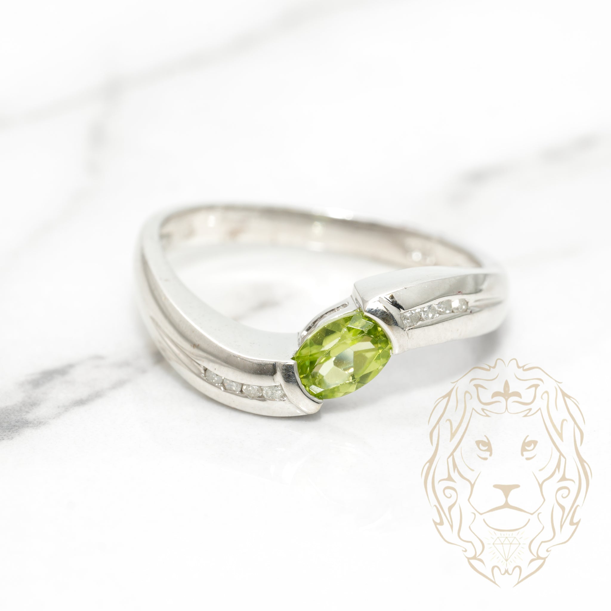 This 10K white gold engagement ring, featuring 0.35CT tension-set oval-cut peridot and 0.10CT natural diamonds, is a bold and elegant choice.