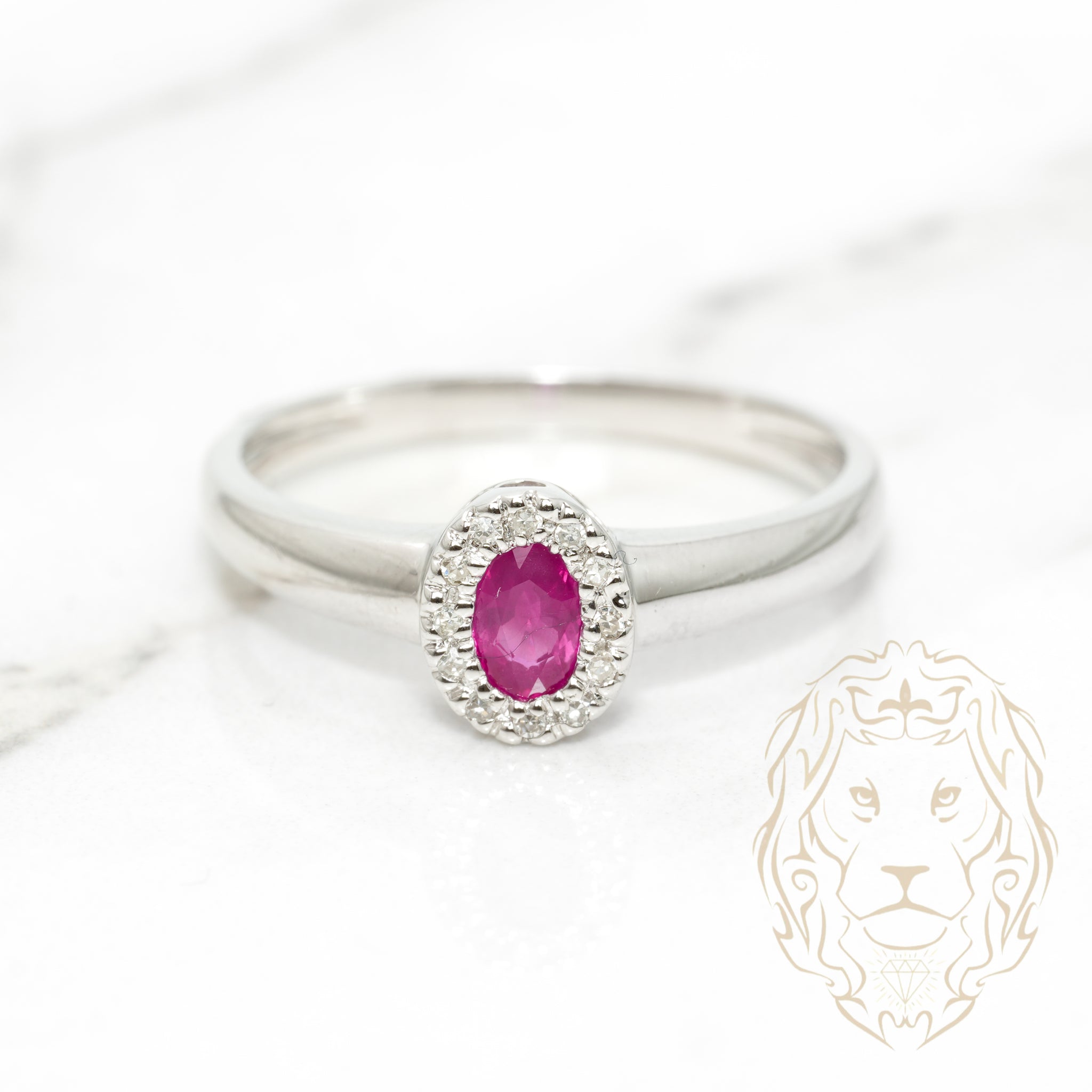 This 14K white gold engagement ring, with a 0.25CT oval-cut ruby halo and 0.08CT natural diamonds, is a romantic and refined choice.