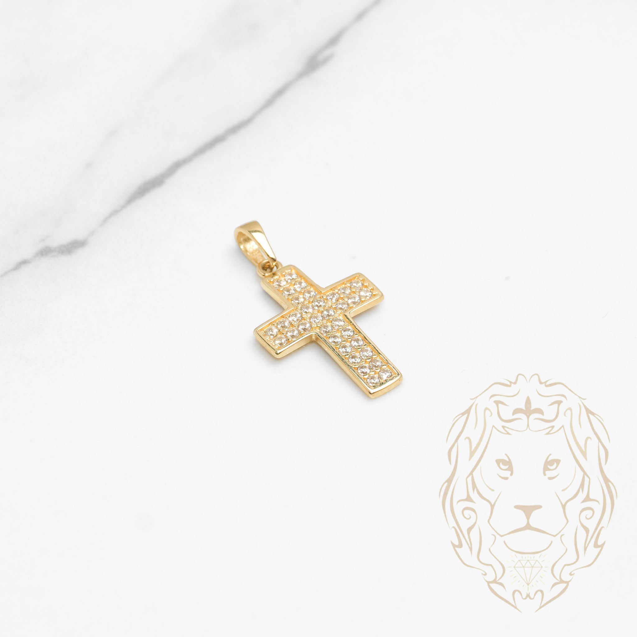 This 10K yellow gold cross pendant is entirely set with cz, for timeless elegance.