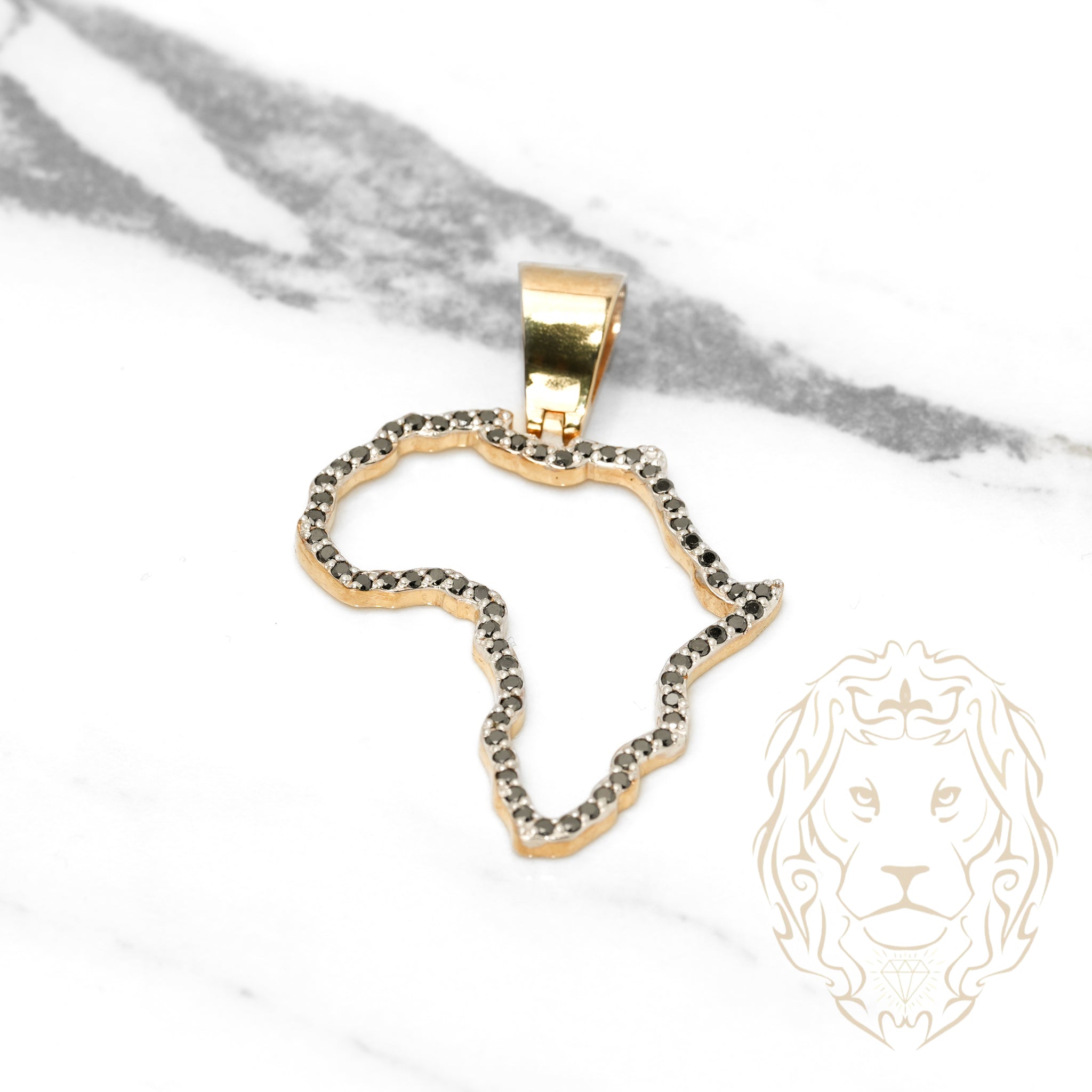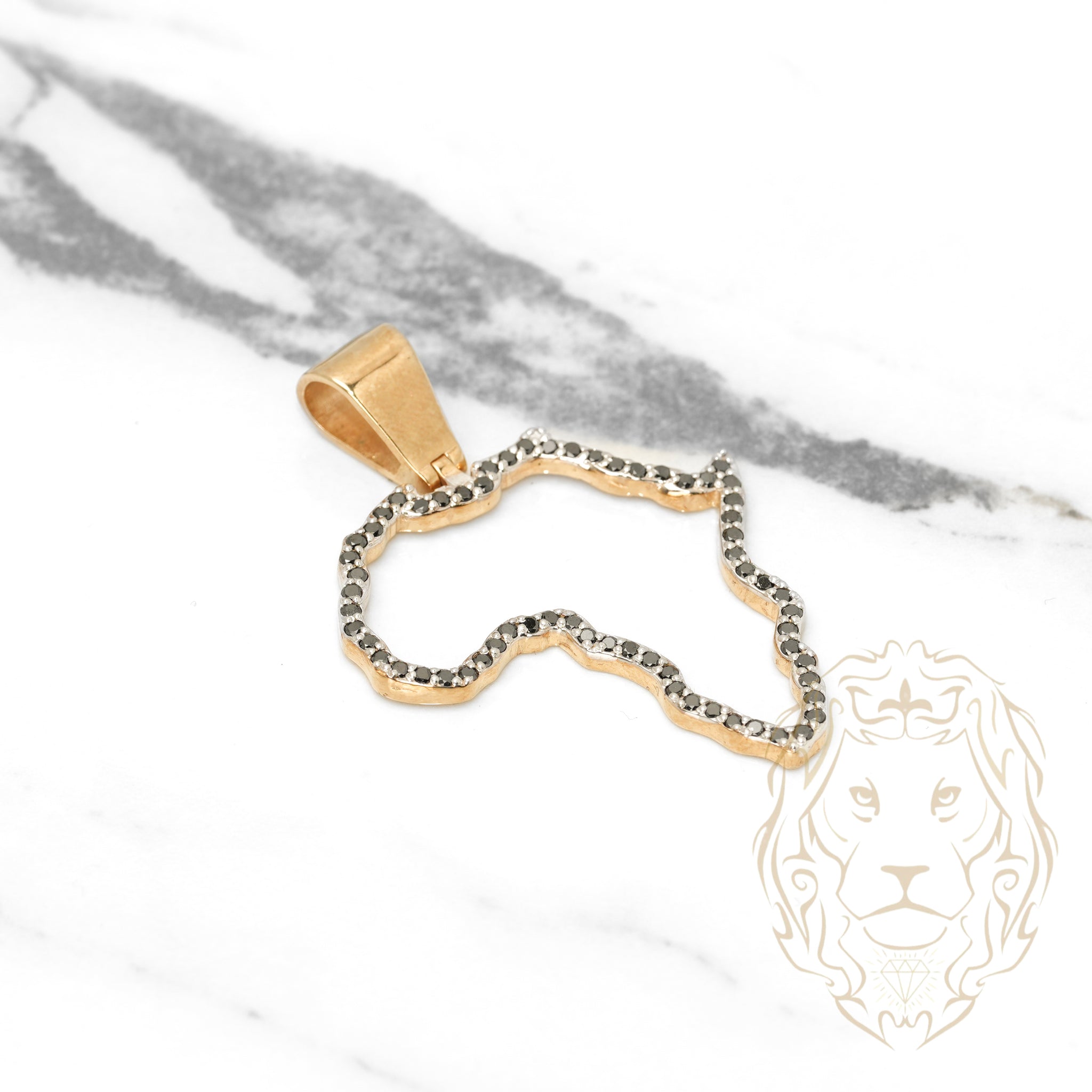 This pendant in two-tone 10K gold with the outline of Africa is sublimated by 1.00CT of natural black diamonds. A powerful piece, full of meaning and style.