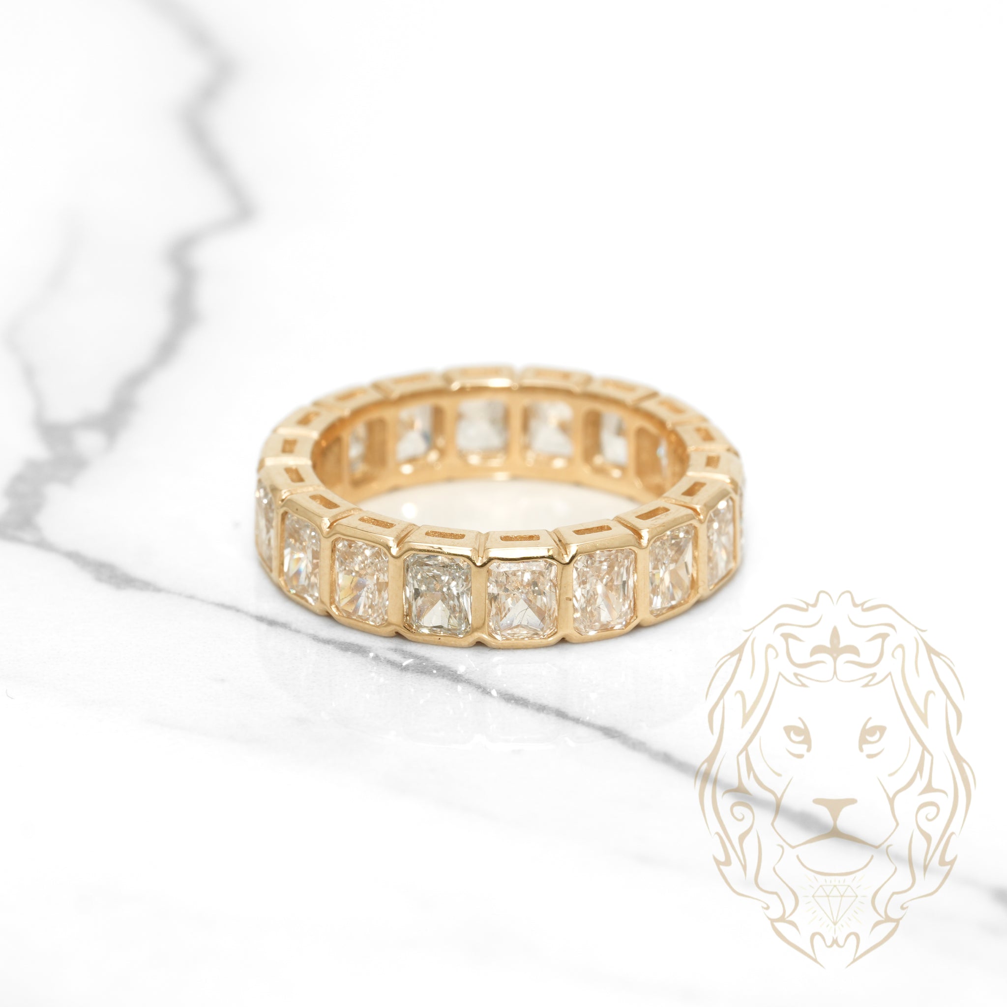 This eternity ring in 14K yellow gold, adorned with 4.32 carats of radiant-cut laboratory diamonds, offers a dazzlingly sophisticated allure.