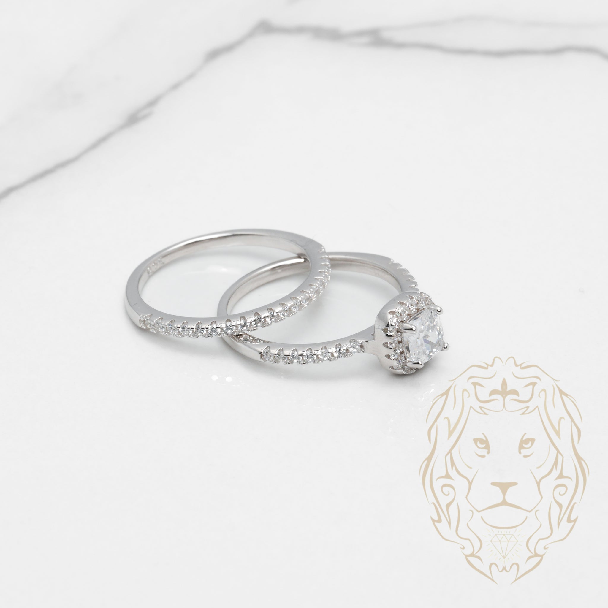 Ensemble en argent comprenant une bague halo cz coupe coussin et une alliance semi-éternité. Un style romantique et harmonieux.