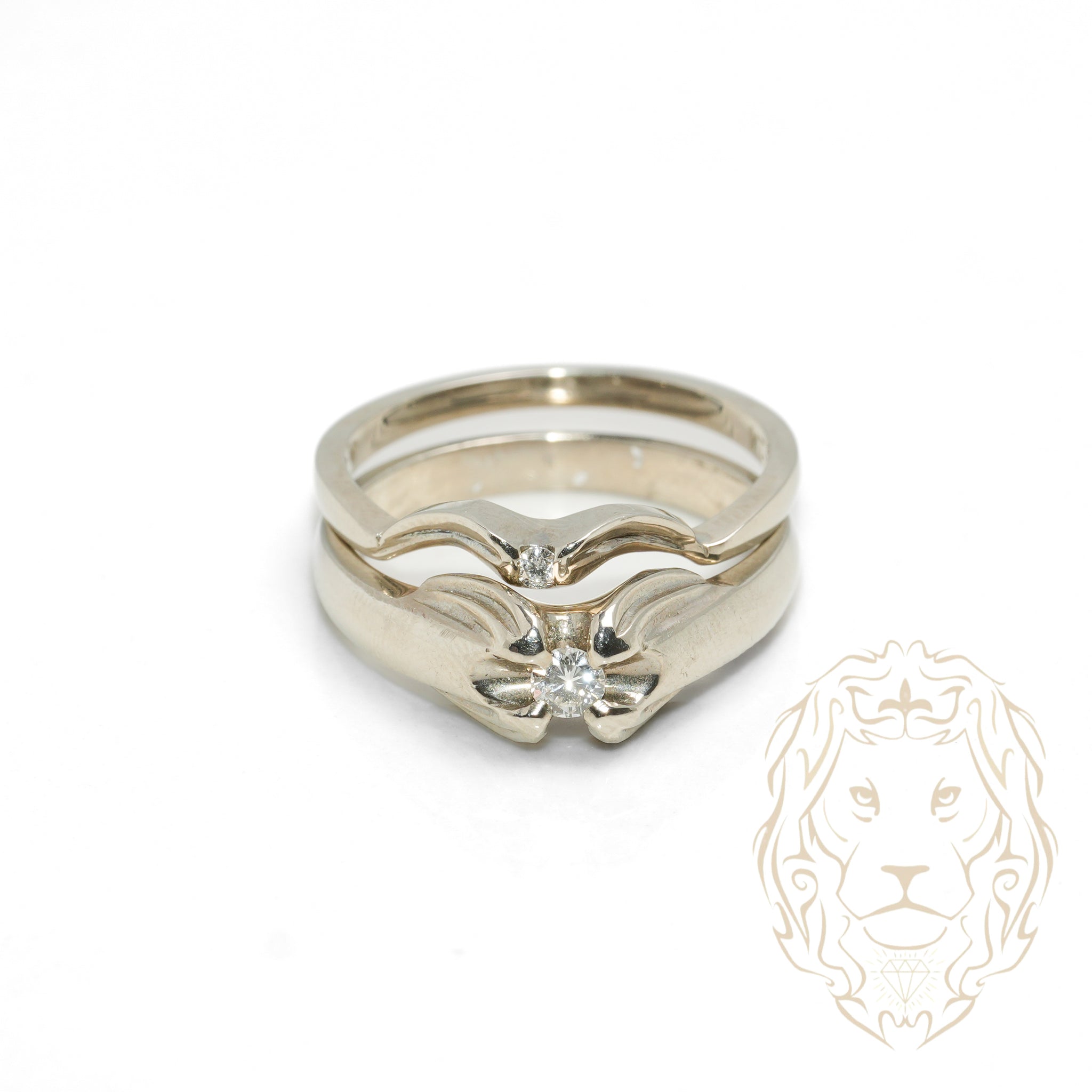 This engagement ring in 10K white gold is set off by a round brilliant-cut natural diamond, accompanied by a wedding band for an elegant union.