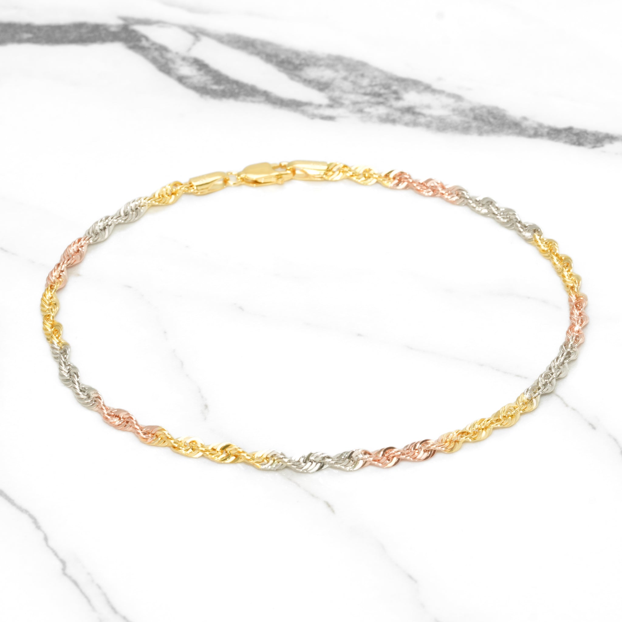 This tri-color 10K gold anklet, combining yellow, white and pink hues, is delicately twisted with a 3.2mm laser cut finish. With a length of 10 inches, it's ideal for highlighting your ankles while adding a chic, refined note to your look. Whether worn alone or layered with other bracelets, it's perfect for all occasions, from casual outings to more formal events.