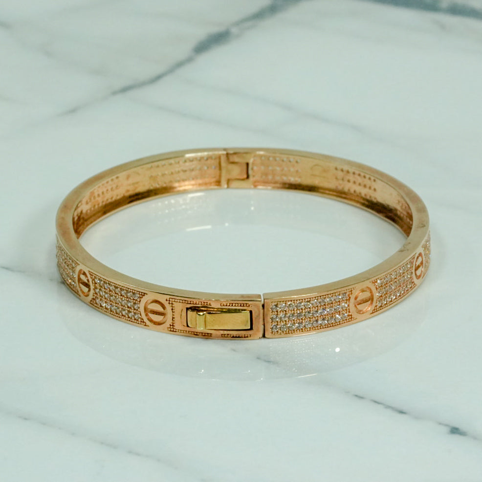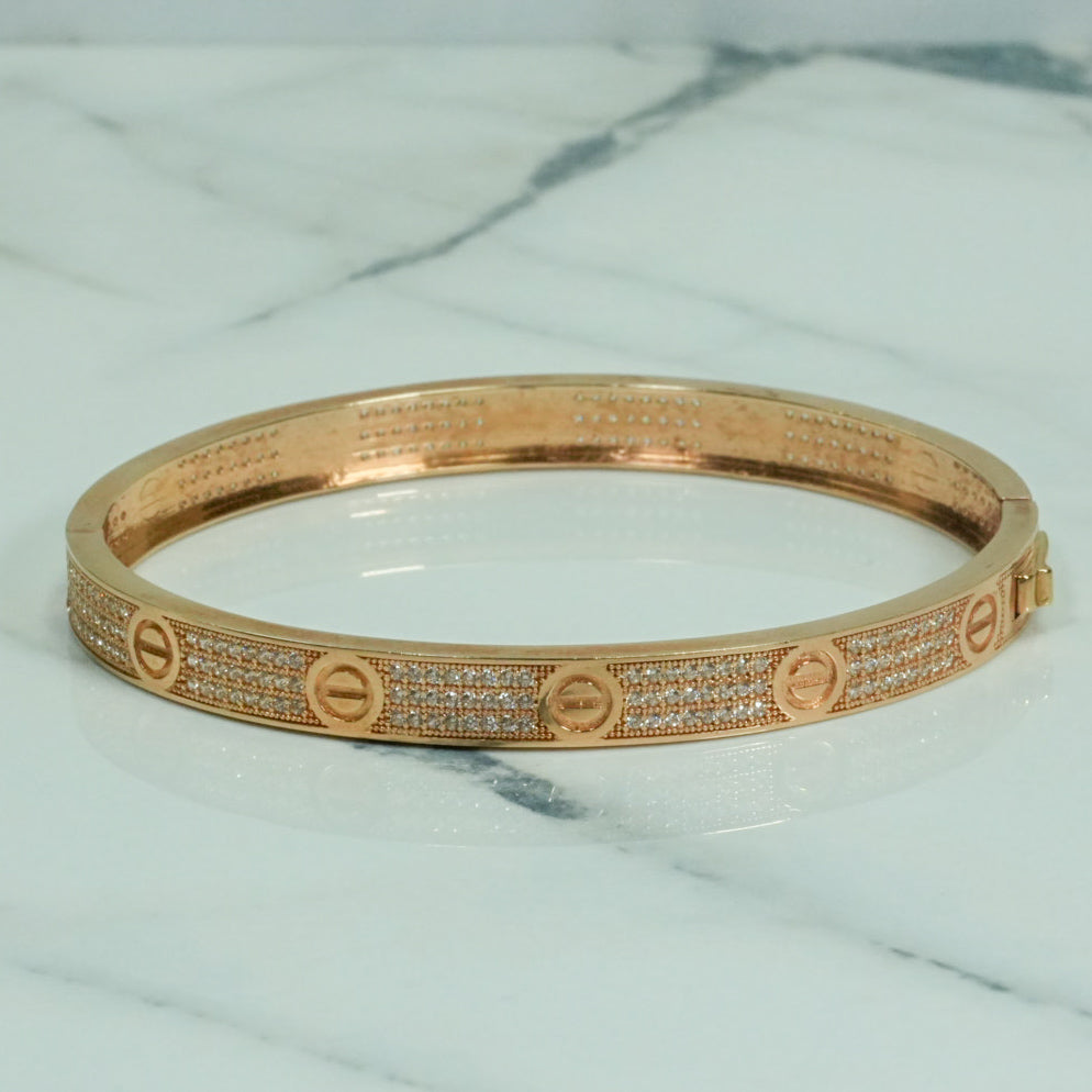 Discover our unisex pavé d'amour bracelet in 10k rose gold, a timeless piece that combines elegance and modernity. This refined bangle, adorned with sparkling pavé stones, is designed to suit any occasion, adding a touch of sophistication to your style. Its 10k rose gold finish offers a delicate, warm glow, perfect to sublimate your daily outfits or for special events. An exceptional jewel, a symbol of love and refinement.