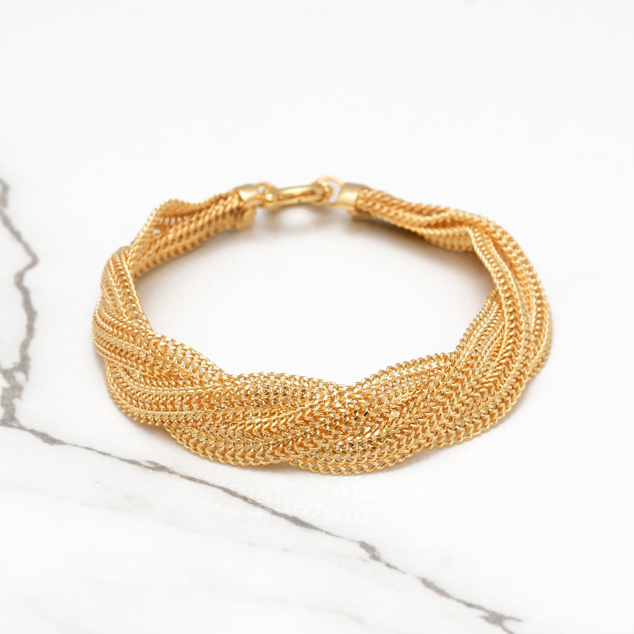 This 14K yellow gold bracelet with braided Cuban links offers a unique, modern design.