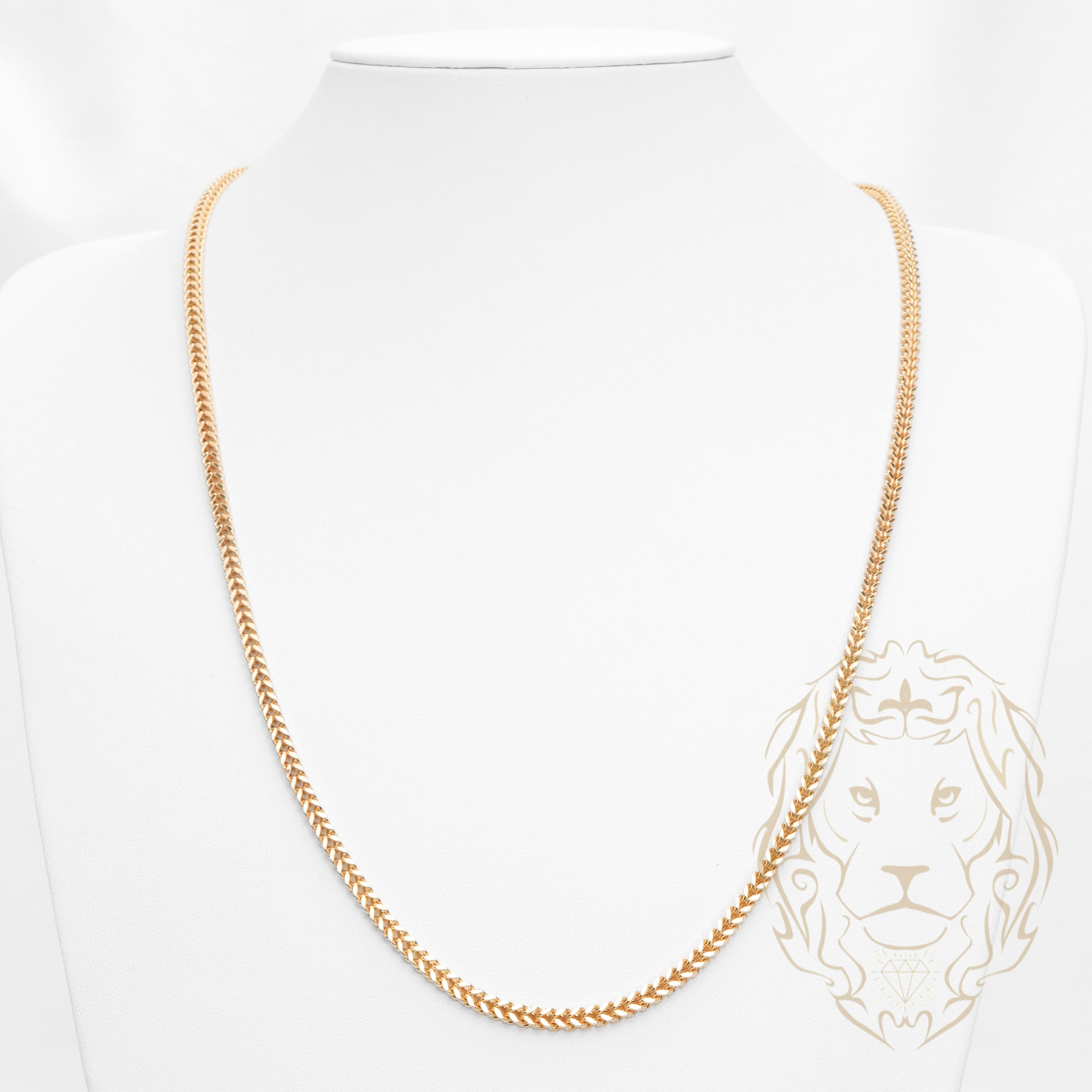 Fabriquée en or jaune 10K, cette chaîne franco de 3.2mm se distingue par ses maillons carrés entrelacés, offrant une excellente durabilité et un style moderne. Parfaite pour un usage quotidien ou pour supporter un pendentif.