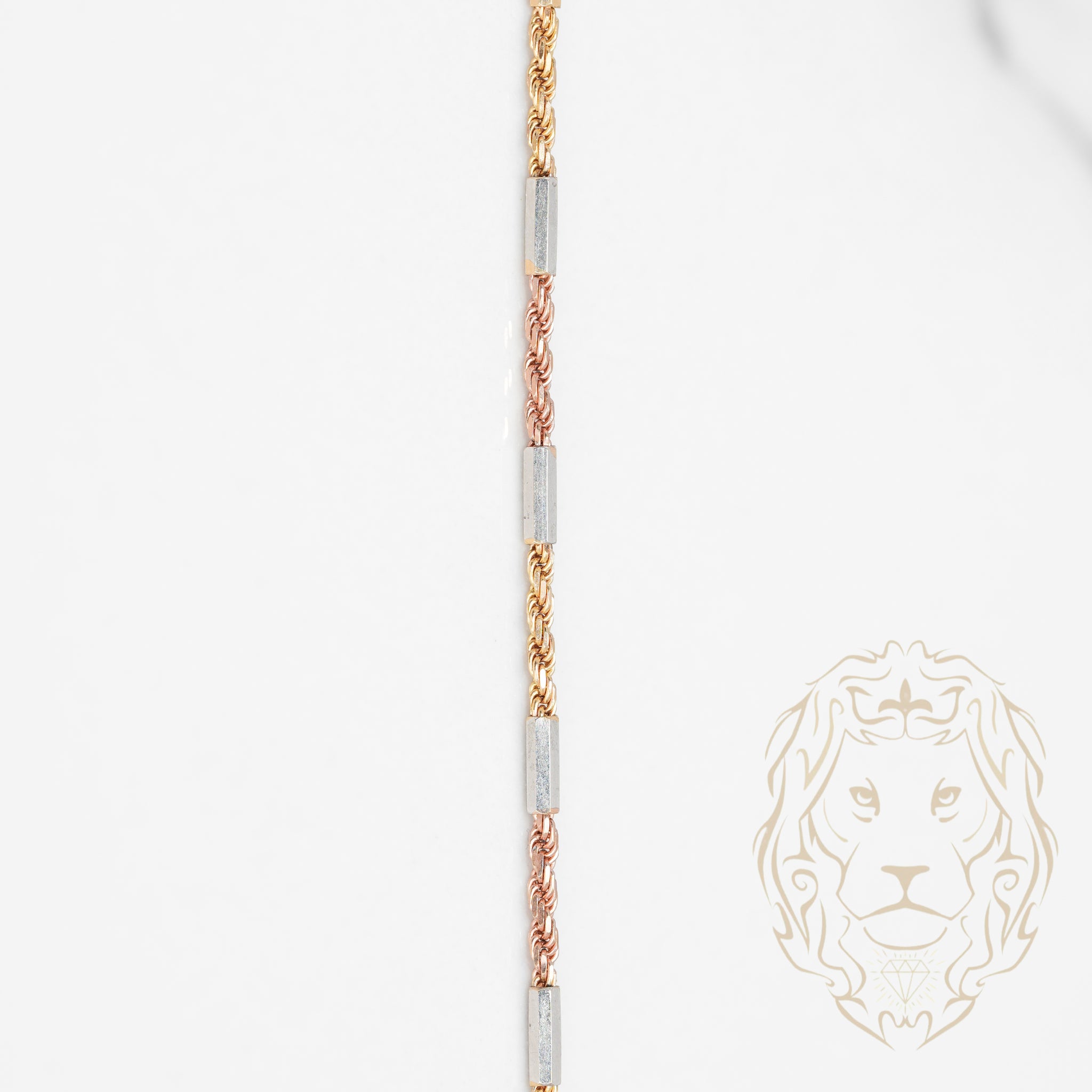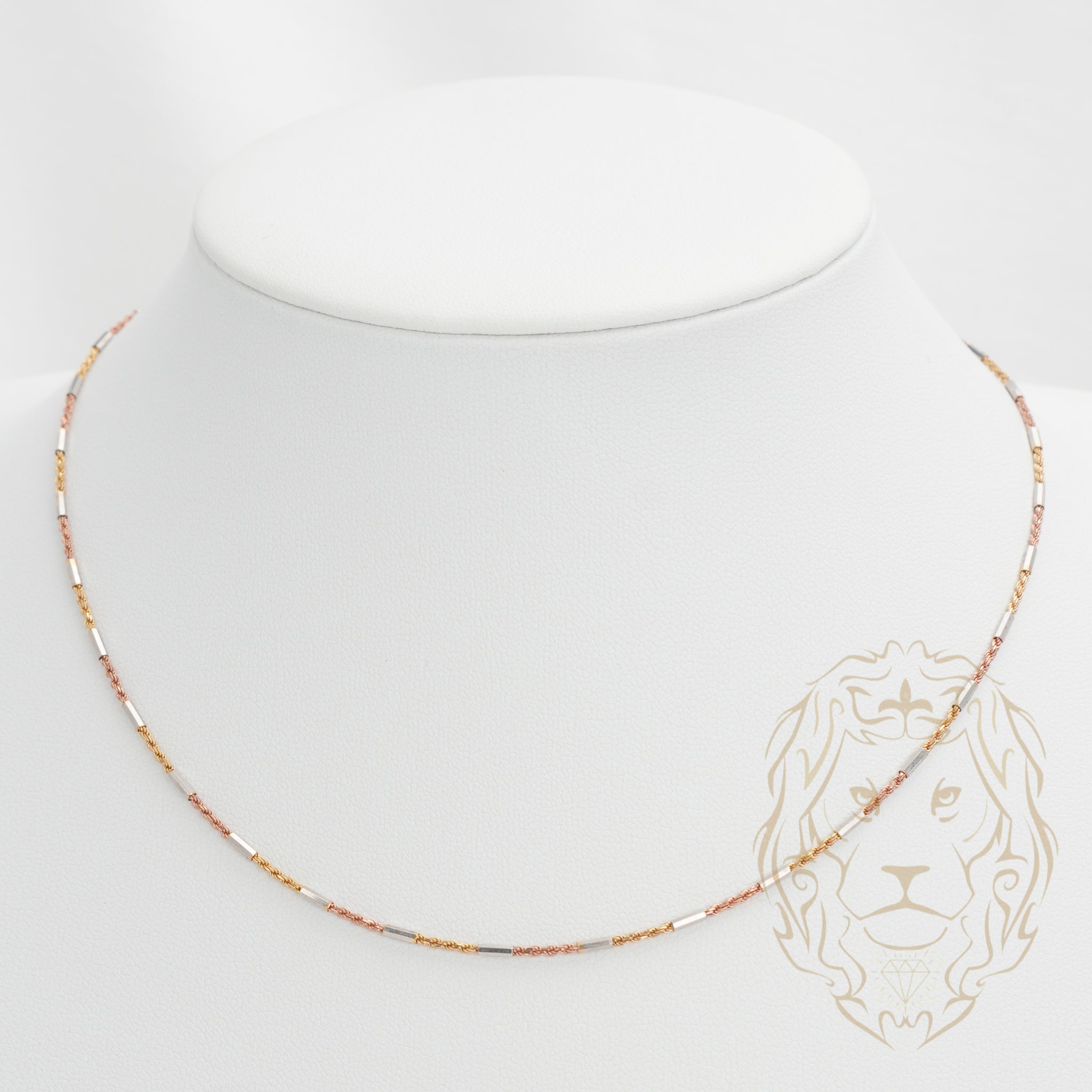 This 10K gold chain combines twist and bullet styles in a 1.5 mm tricolor format. Ideal for those looking for an original and refined piece of jewelry.