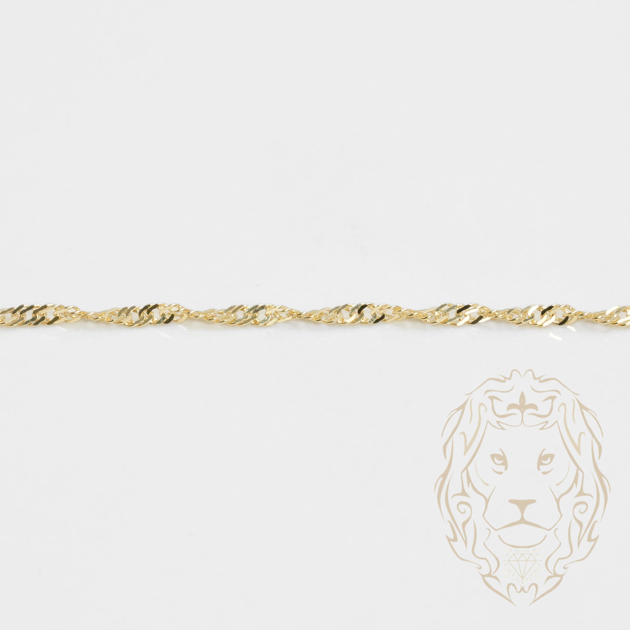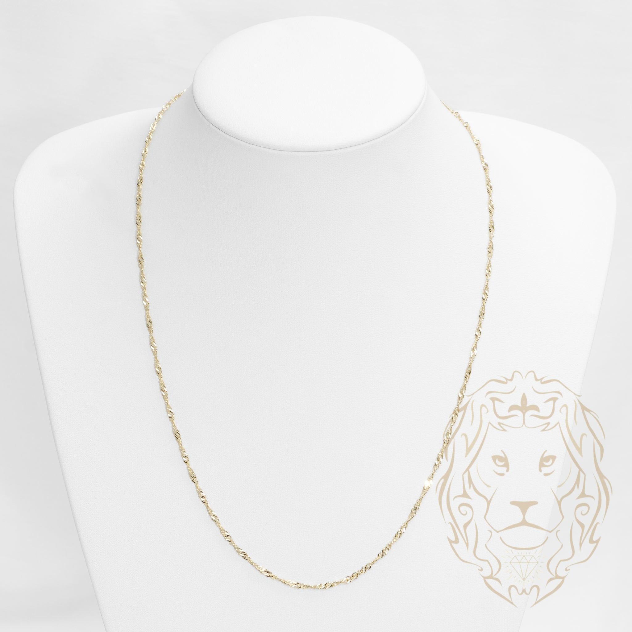 La chaîne singapour en or 10K jaune de 2mm capte la lumière sous tous les angles grâce à son motif torsadé délicat.