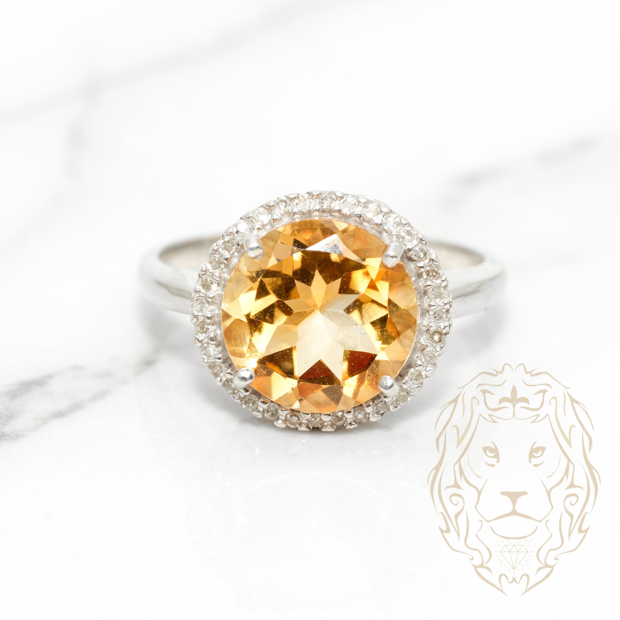 This 10K white gold engagement ring, featuring a 2.00CT brilliant-cut citrine surrounded by 0.25CT pavé-cut natural diamonds, illuminates every moment with its warm radiance.