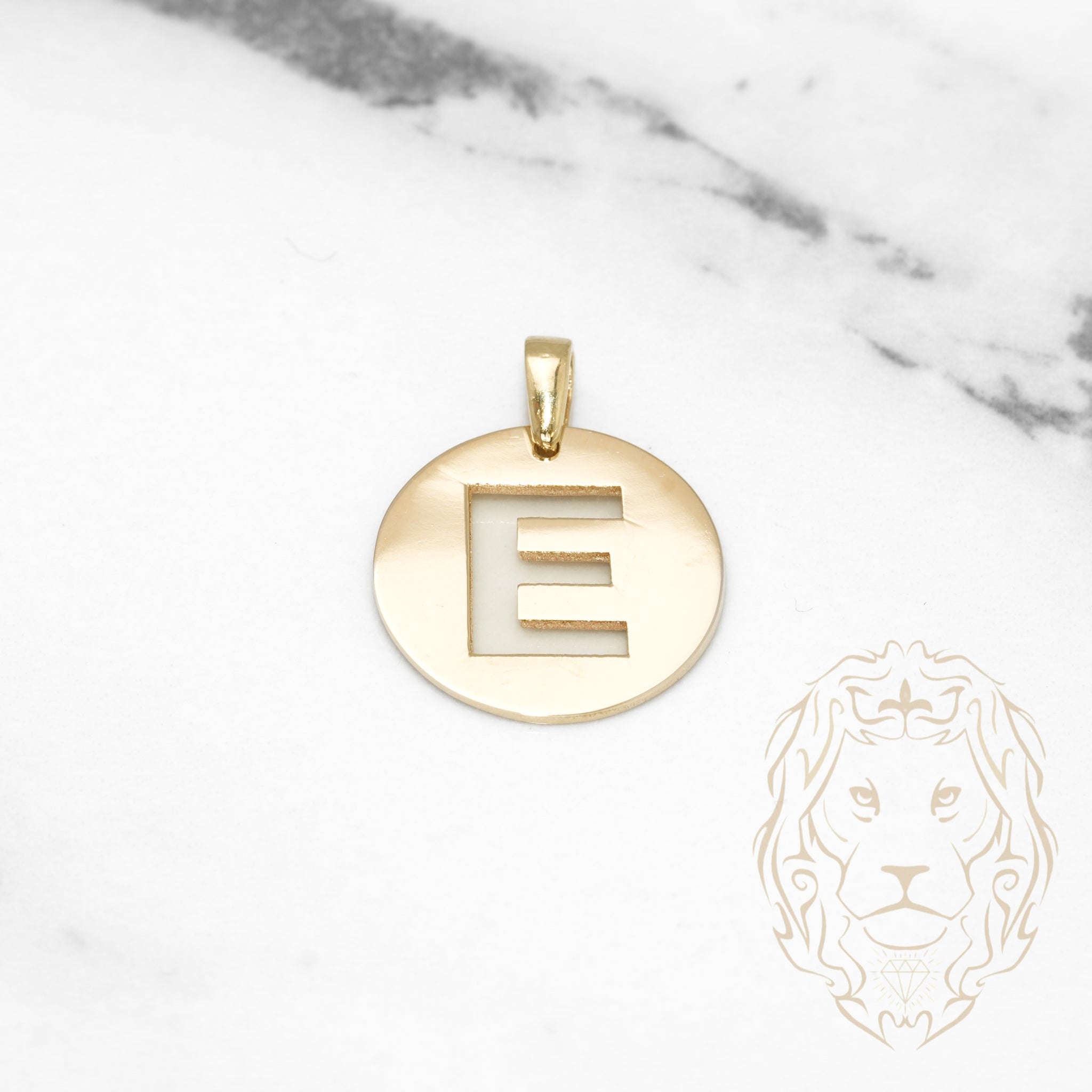This 10K yellow gold pendant features the letter "E" with a polished stencil design, adding a refined touch to your outfit.