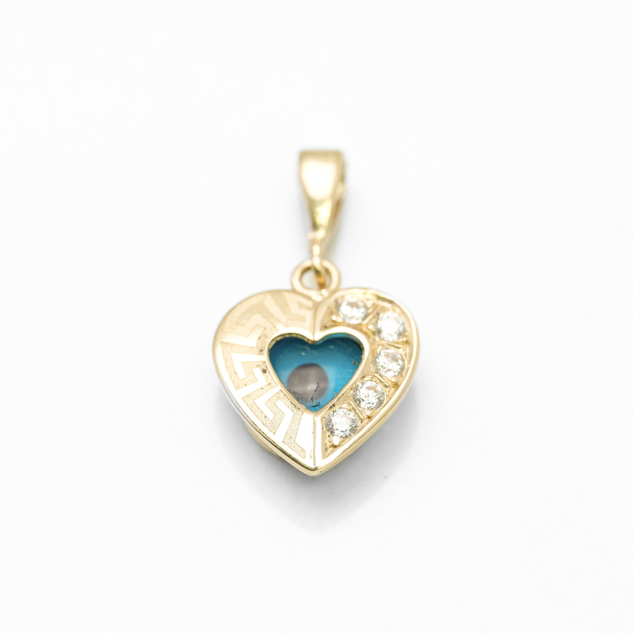 This 10K yellow gold pendant features a heart-shaped evil eye, enhanced with a Greek key motif and paved with cz, offering protection in a luxurious, elegant design.
