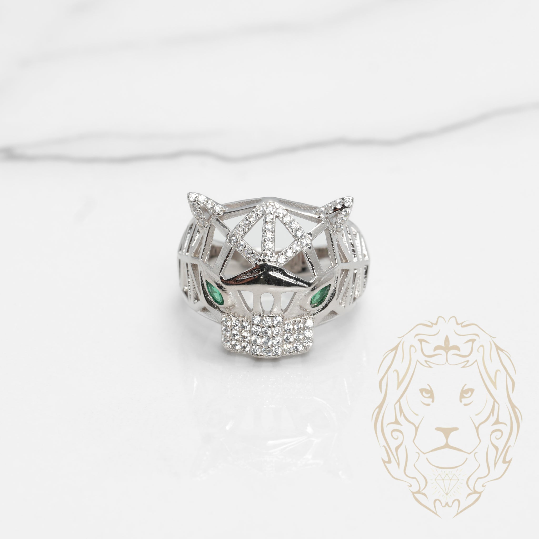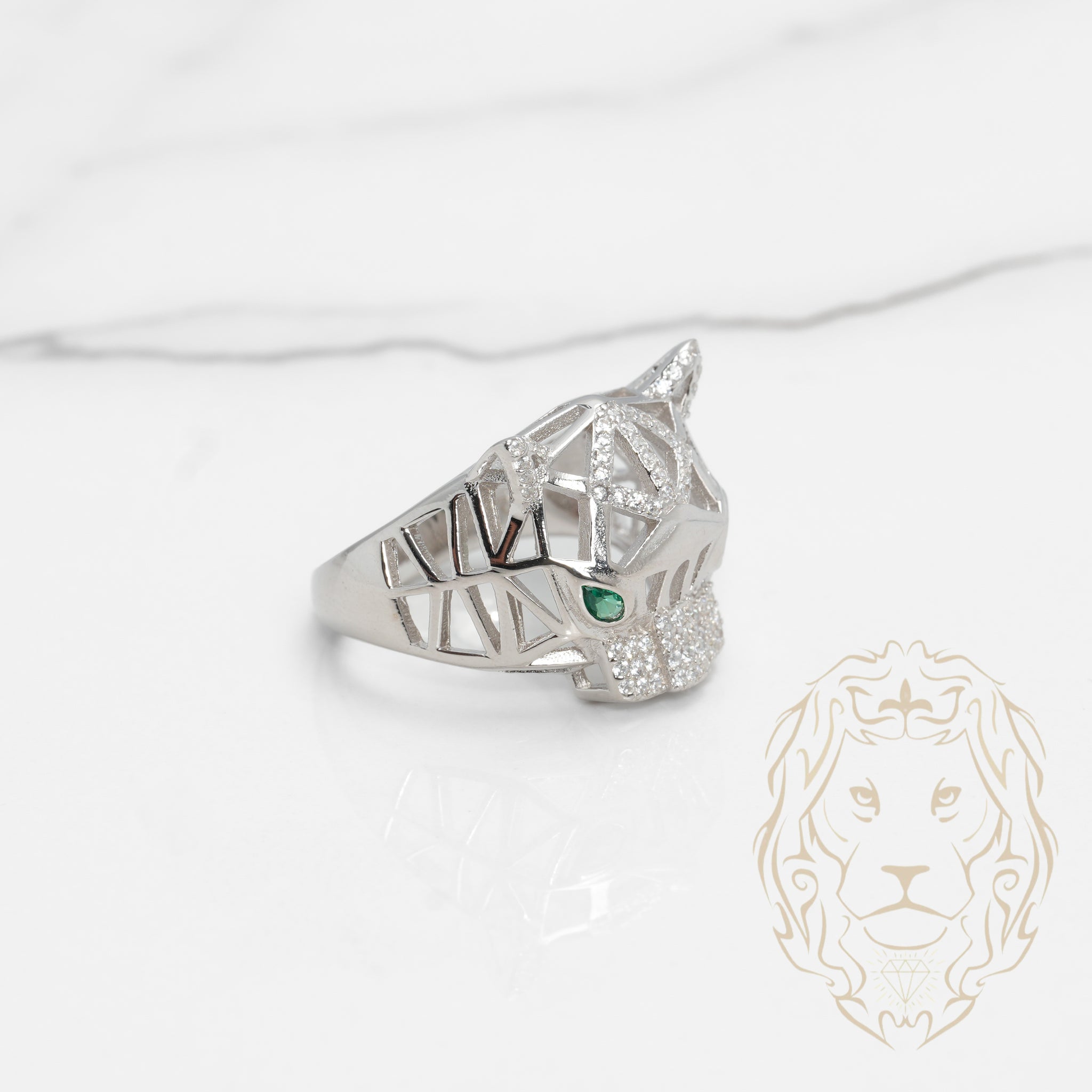 Une bague audacieuse en argent représentant une tête de panthère au design géométrique, rehaussée de cz pour un éclat saisissant.