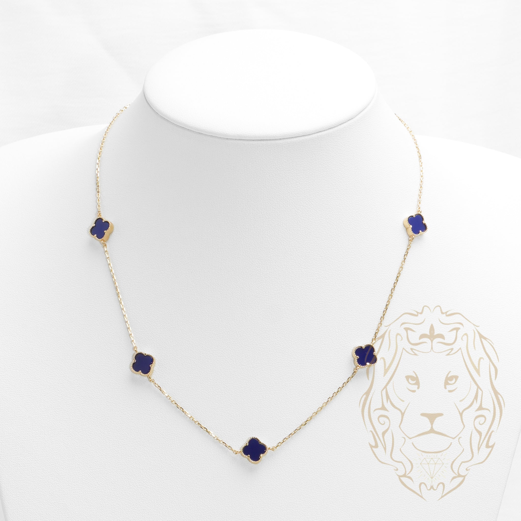This necklace in 10K yellow gold with 9.5mm blue clovers combines color and good luck with elegance.