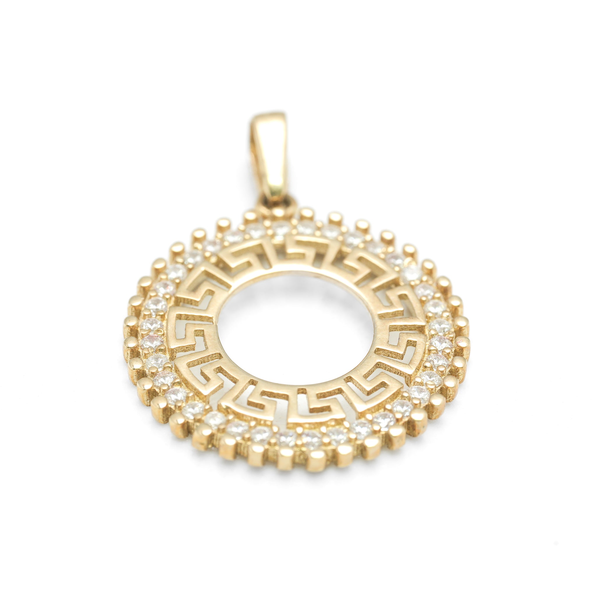 Pendant - 10K Yellow Gold Medallion with Greek Key and Cz Pavement - PEG194