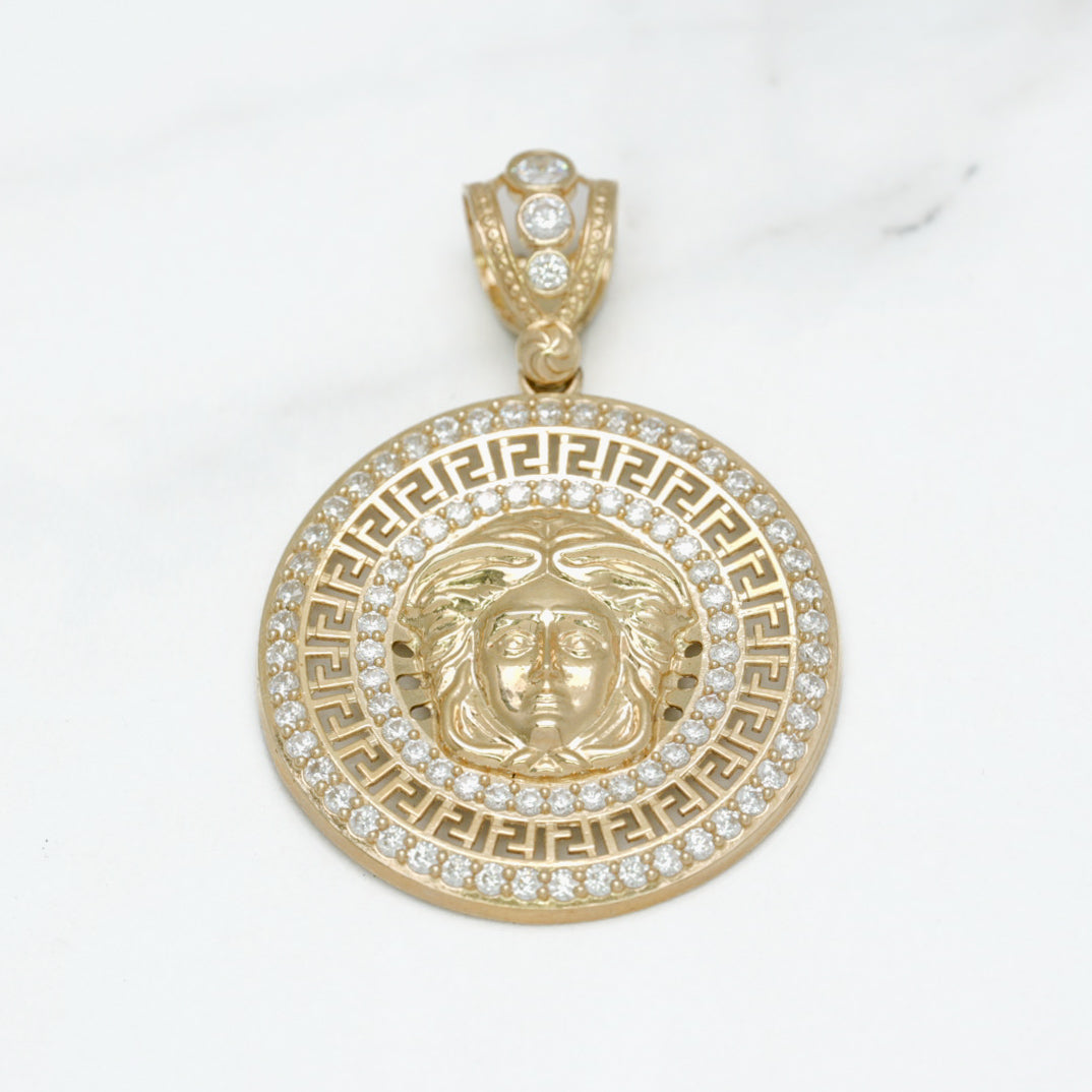 This medallion-shaped pendant in 10K yellow gold with Medusa's head and a Greek key motif, paved with cubic zirconia (cz), is an exceptional piece of jewelry that marries history with modern elegance. Perfect for those who want to stand out with a unique piece.