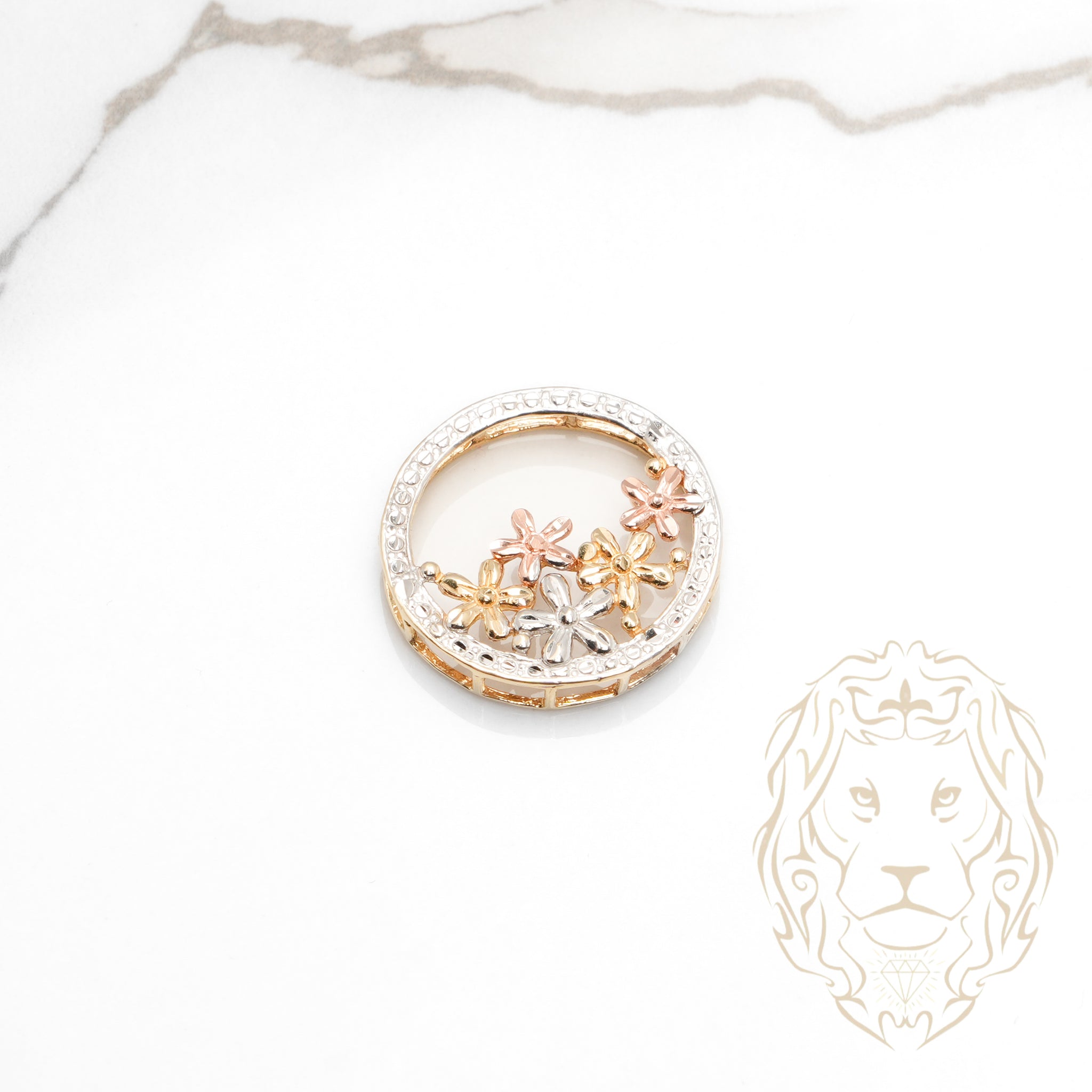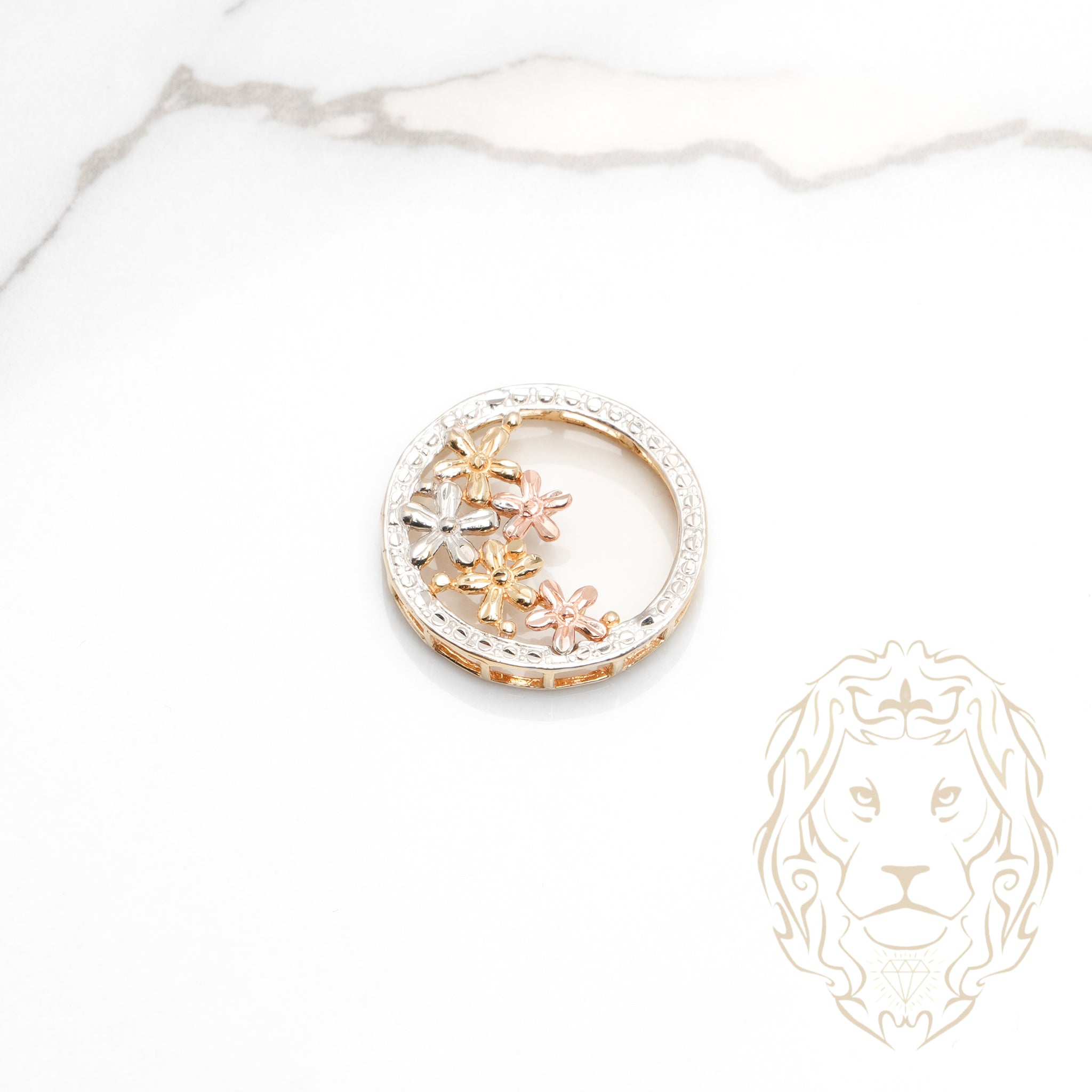 Pendentif cercle en or 14K tricolore avec motifs floraux. Raffiné, coloré et précieux.