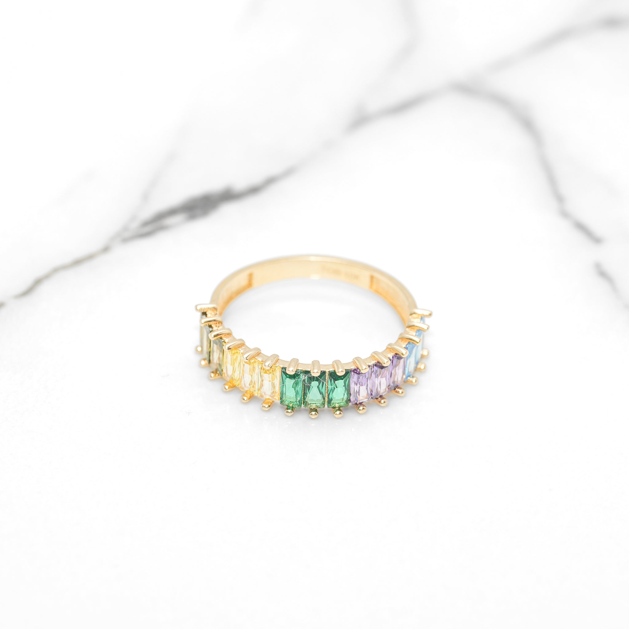 This semi-eternity ring in 10K yellow gold is adorned with multicolored emerald-cut cz stones, creating a vibrant, joyful look ideal for brightening up your day.