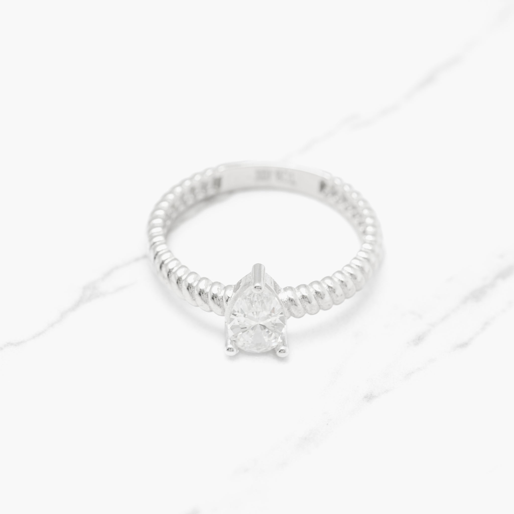 Cette bague en or 10K blanc, avec son design twist et sa pierre cz taille poire, ajoute une touche unique et moderne à votre collection de bijoux.