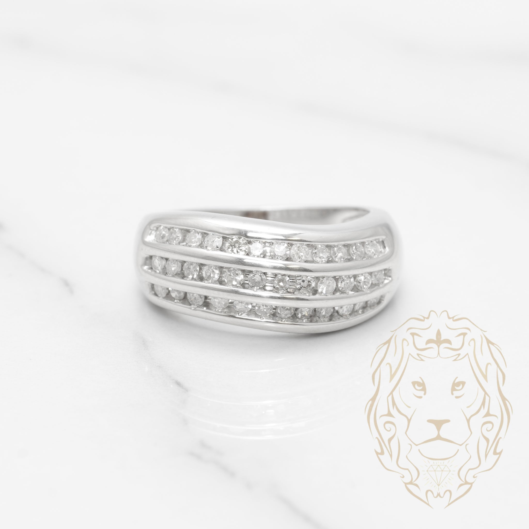 Cette bague en or blanc 10K présente trois rangées ondulées ornées de 0.40 carat de diamants naturels, sertis en canal pour un look fluide et raffiné.