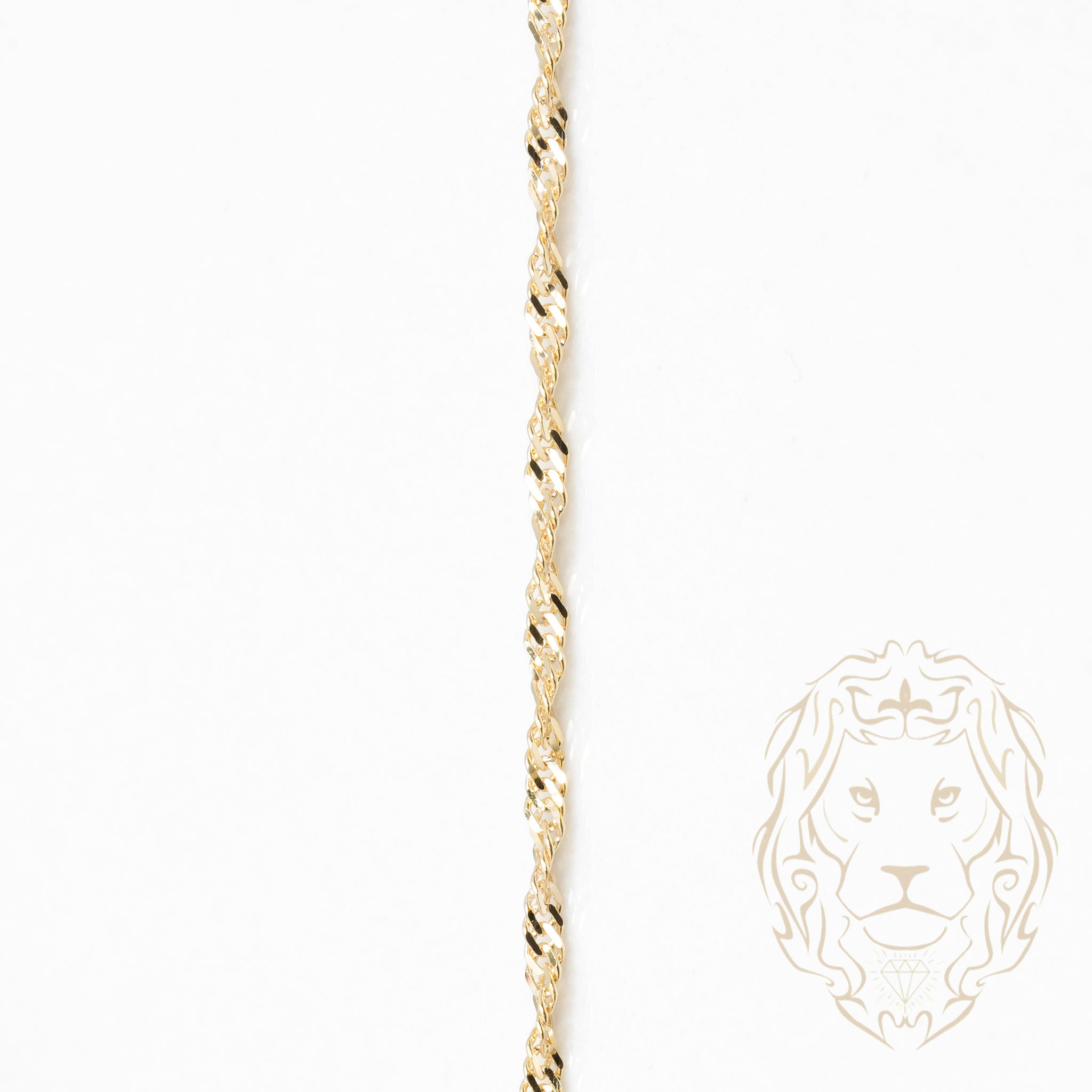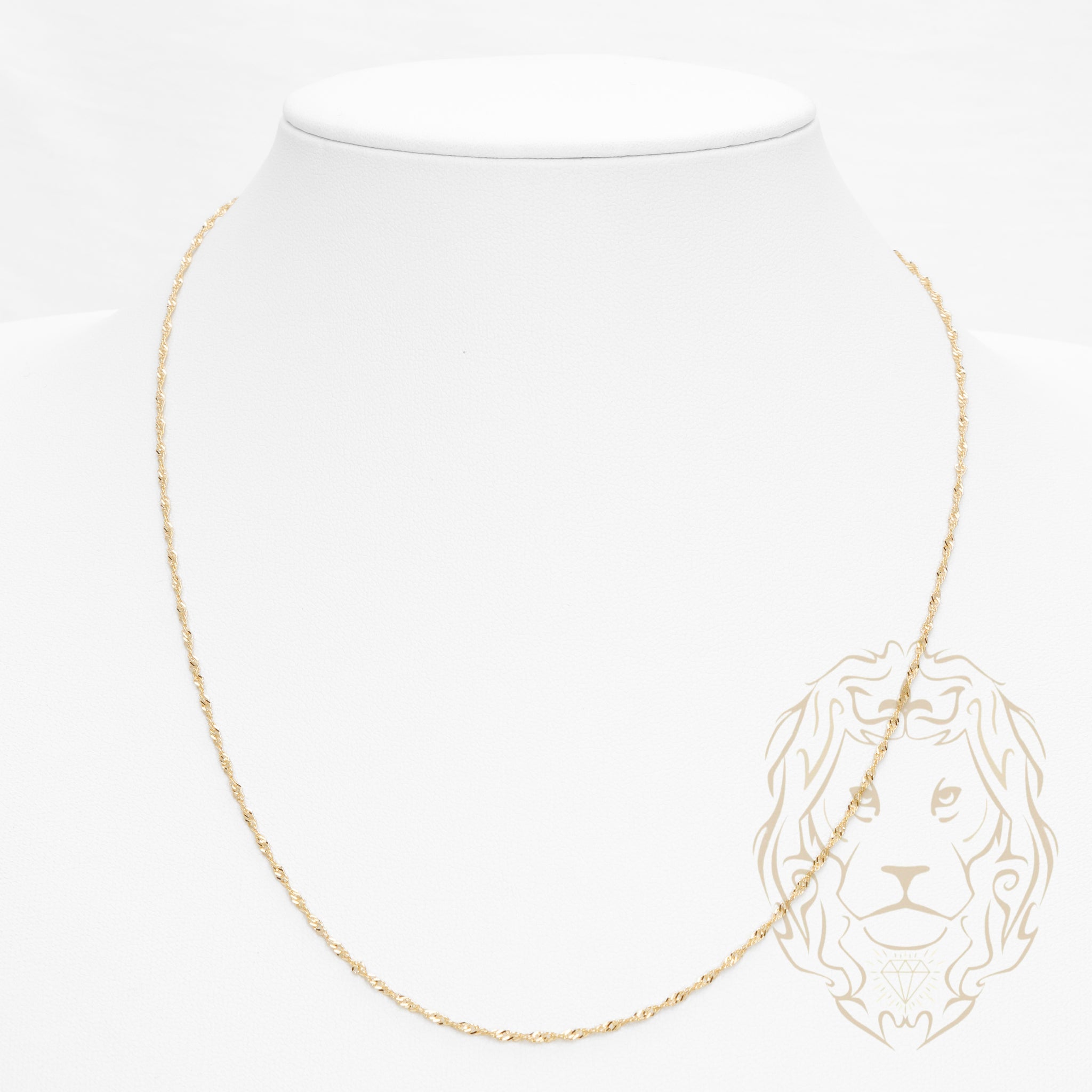 Cette chaîne Singapour 1.5mm en or 10K jaune offre un tressage scintillant, parfait pour celles et ceux qui veulent une présence plus visible sans perdre en élégance.