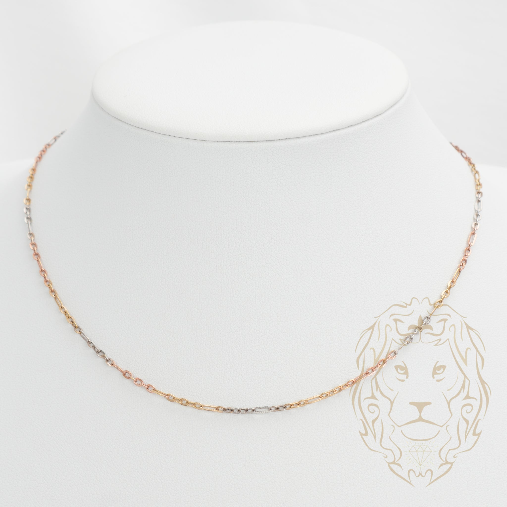 Cette chaîne tricolore en or 10K de 2 mm fusionne les maillons figaro et câble, le tout avec une finition florentine unique. Une pièce élégante et pleine de caractère.
